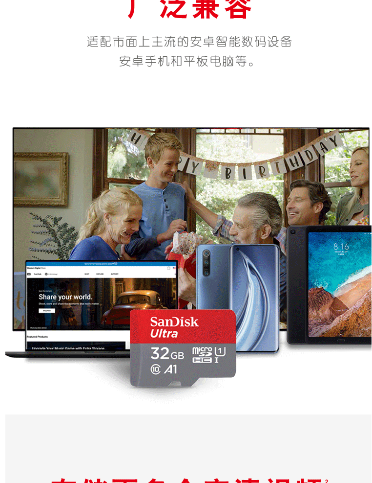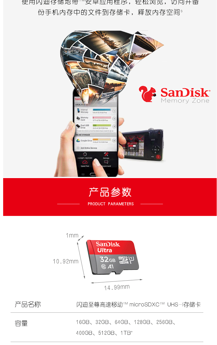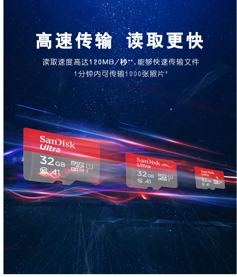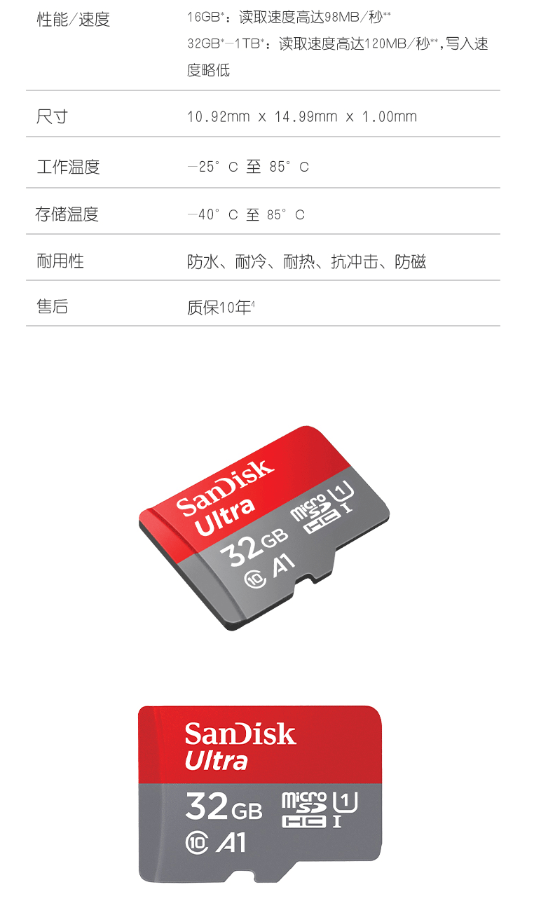 商品名称:闪迪(SanDisk)32GB TF(MicroSD)存储卡 U1 C10 A1 至尊高速内存卡 读速120MB/s