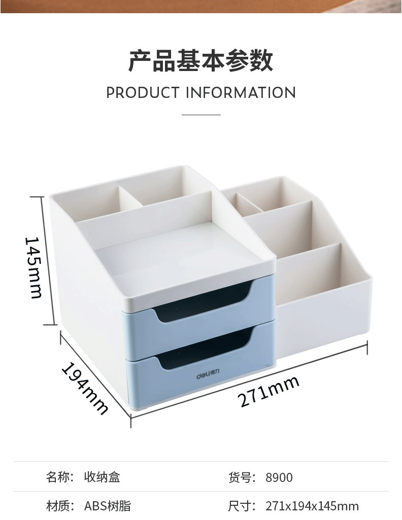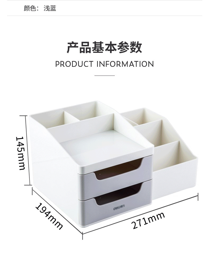 商品名称:得力(deli)九格桌面收纳盒 笔筒 抽屉式储物盒 8900浅蓝