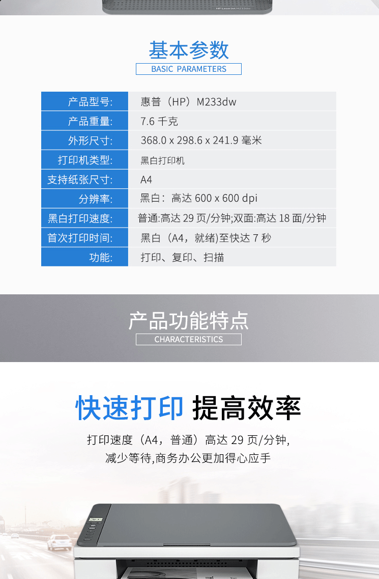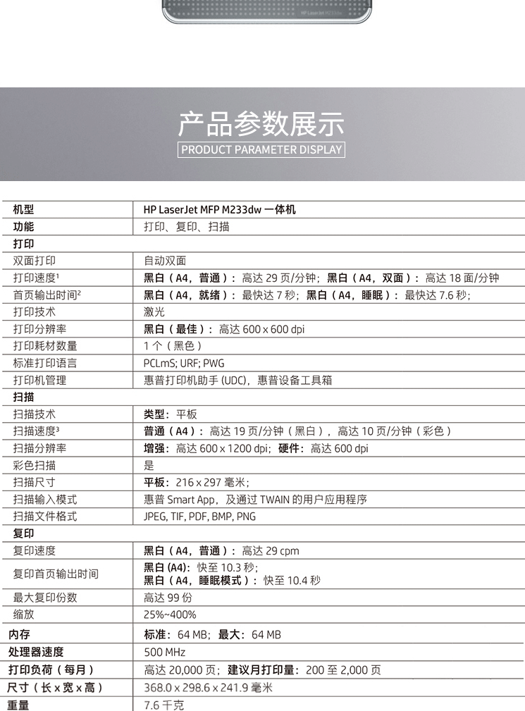 商品名称:惠普(HP)M233dw A4黑白激光一体机 自动双面/无线网络
