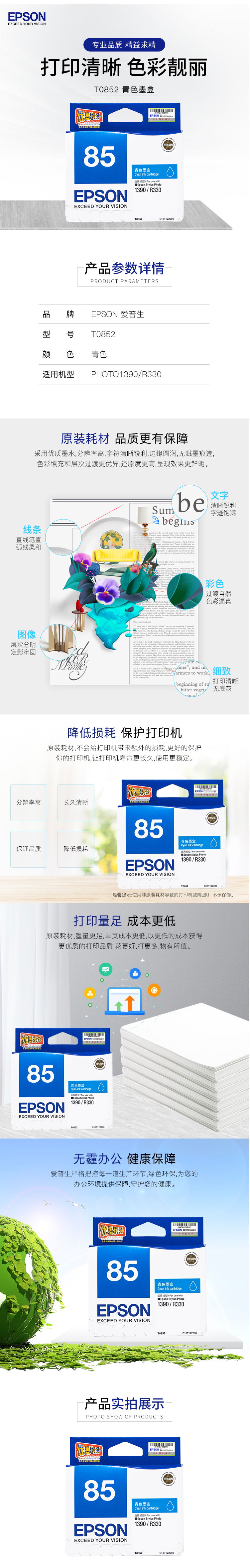 商品名称:爱普生(Epson)T0852 (T1222) 青色墨盒(适用PHOTO 1390 R330)