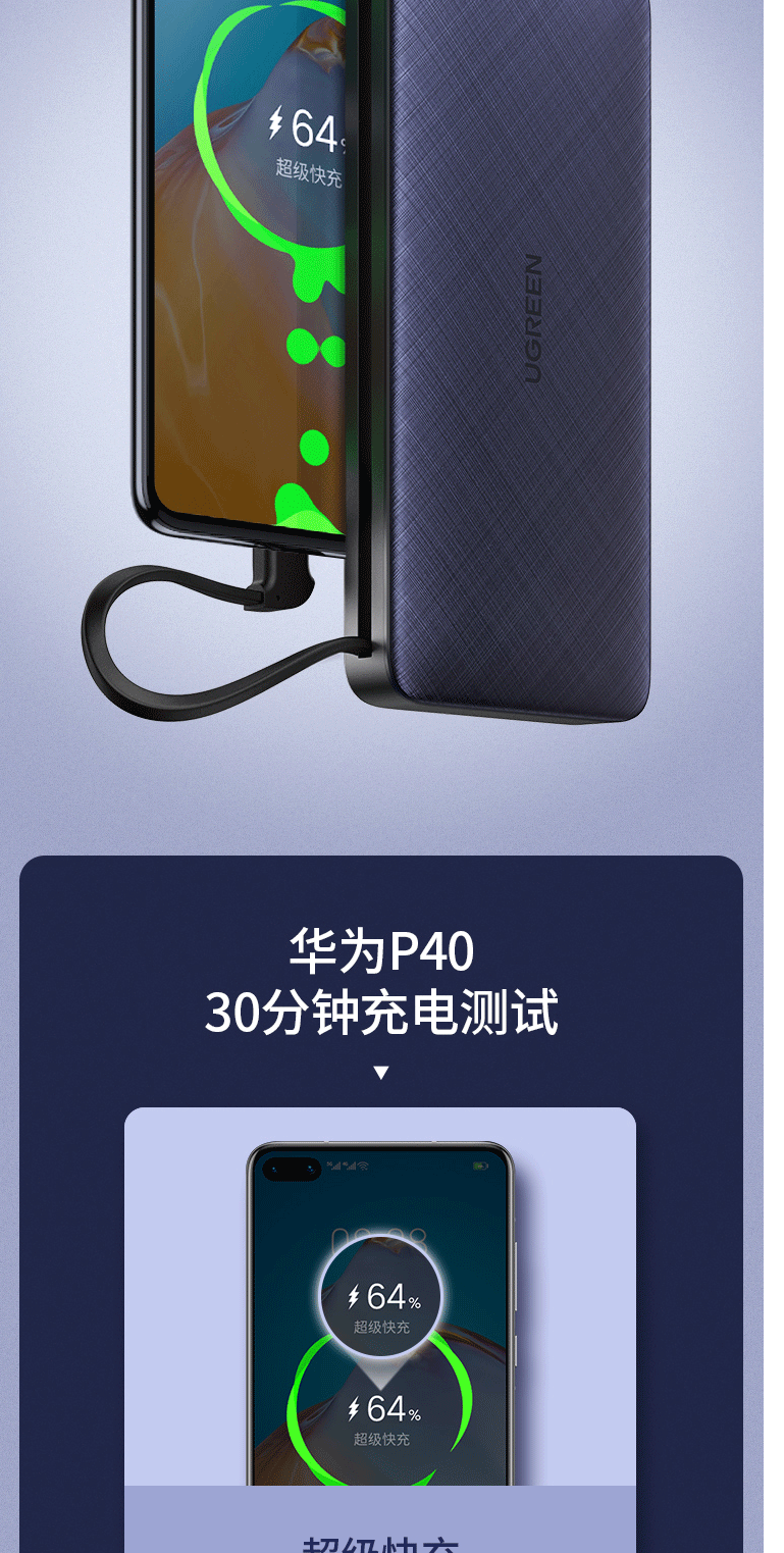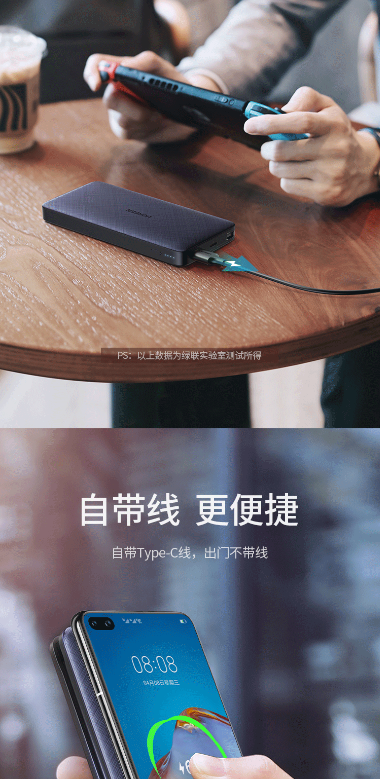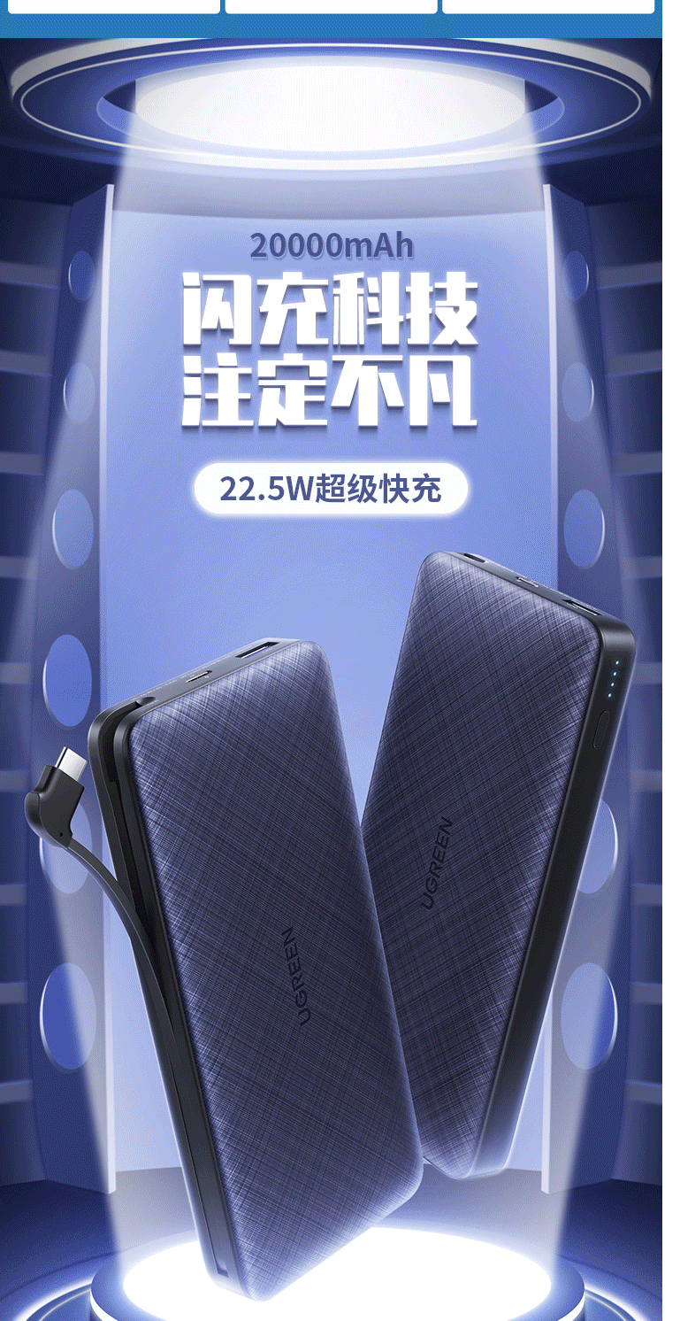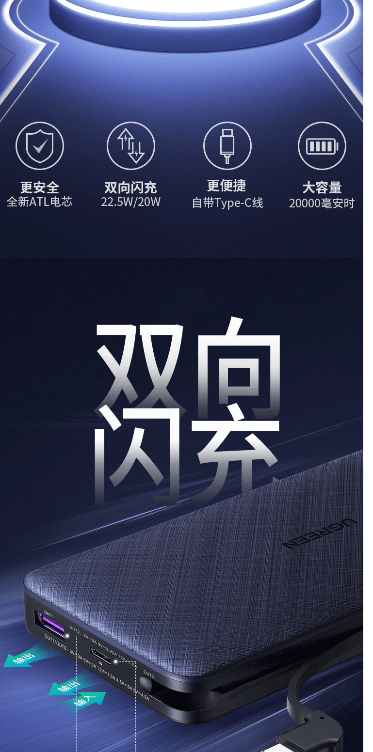 商品名称:绿联 充电宝自带Type-C线22.5W超级快充PD20W移动电源20000毫安时 20550