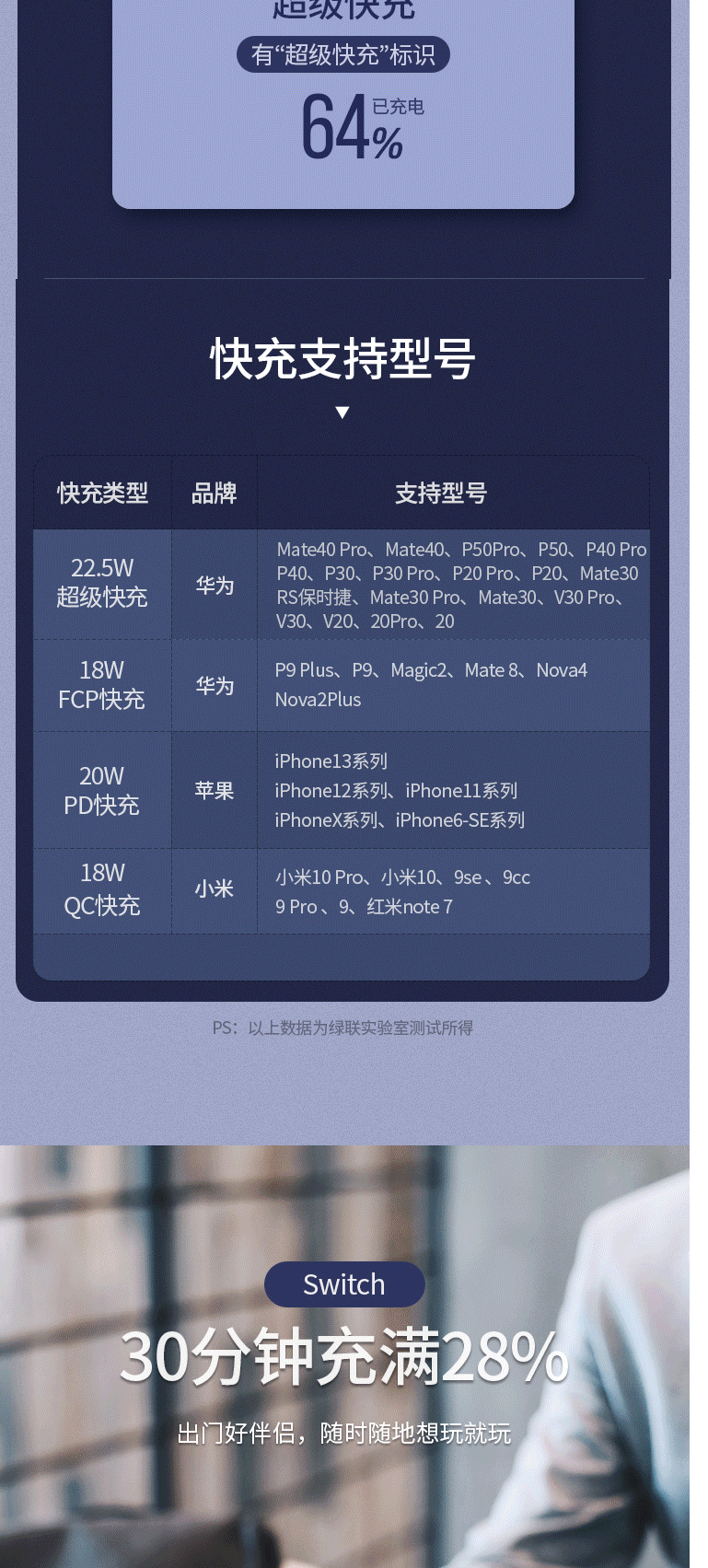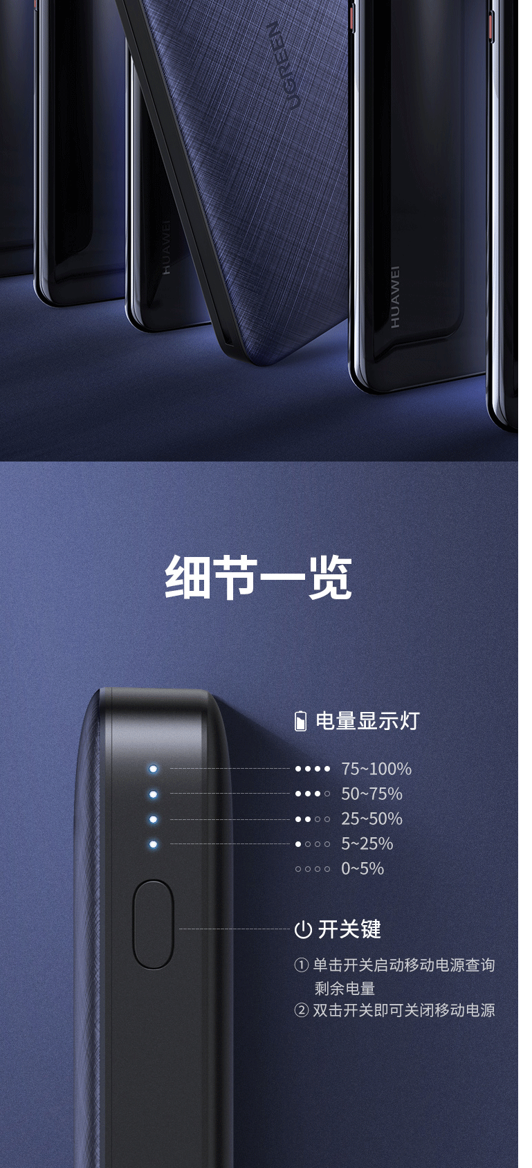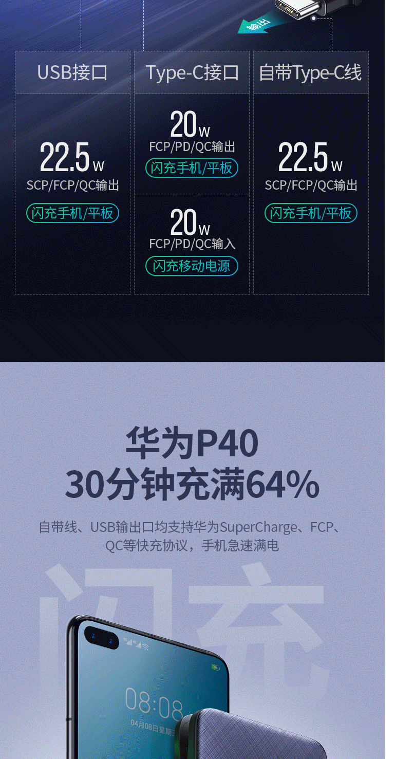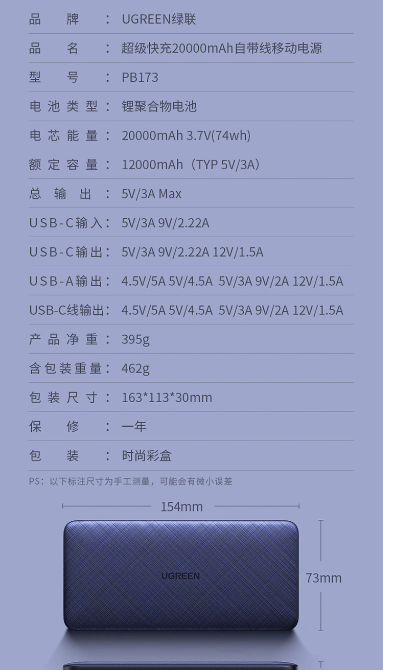 商品名称:绿联 充电宝自带Type-C线22.5W超级快充PD20W移动电源20000毫安时 20550