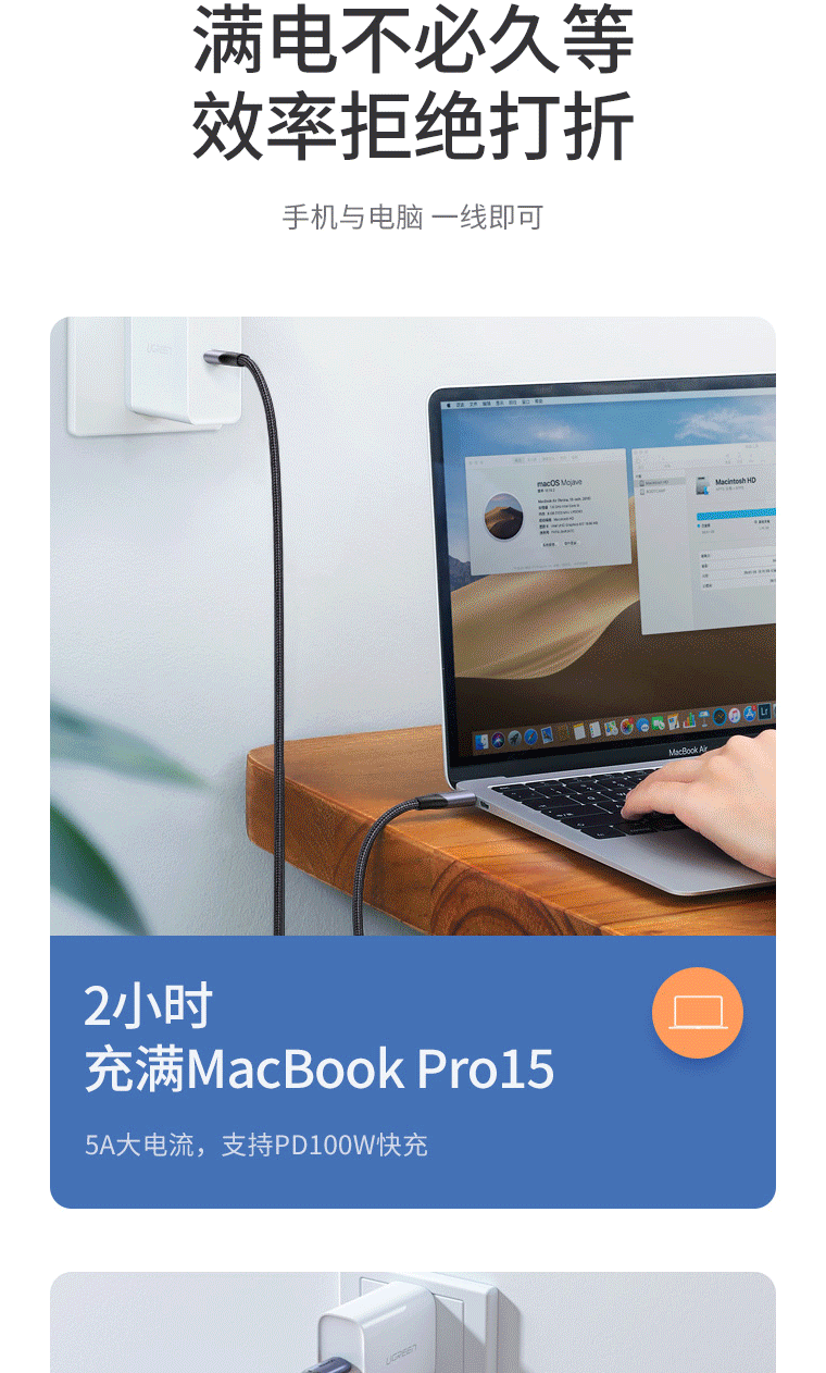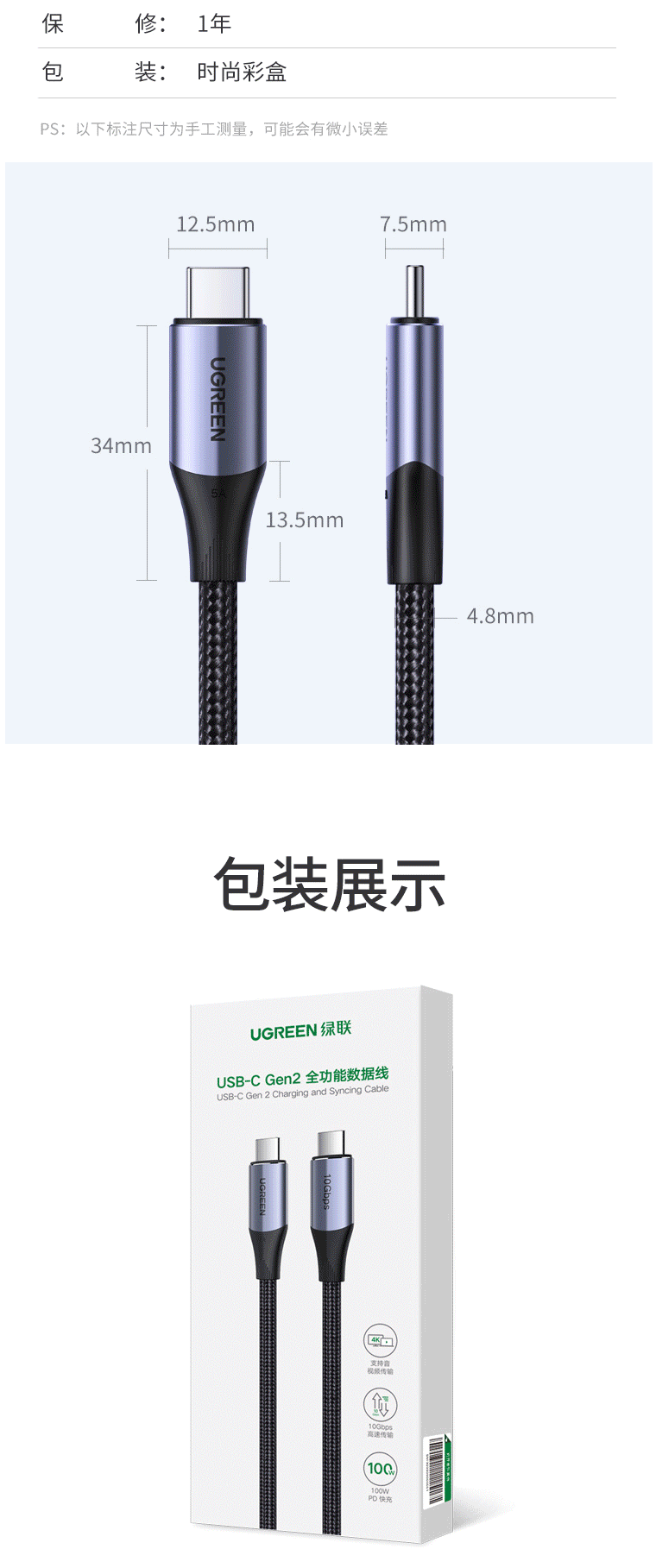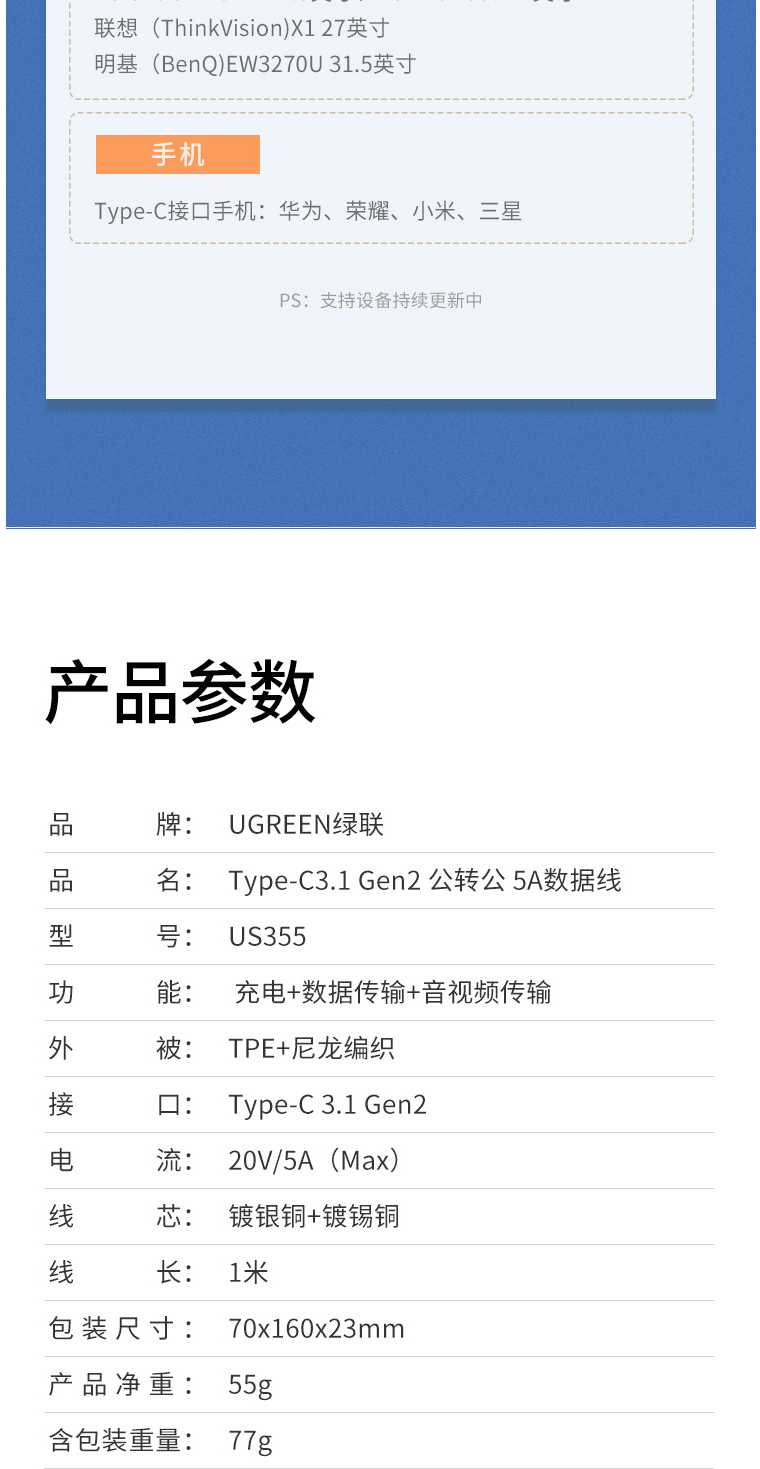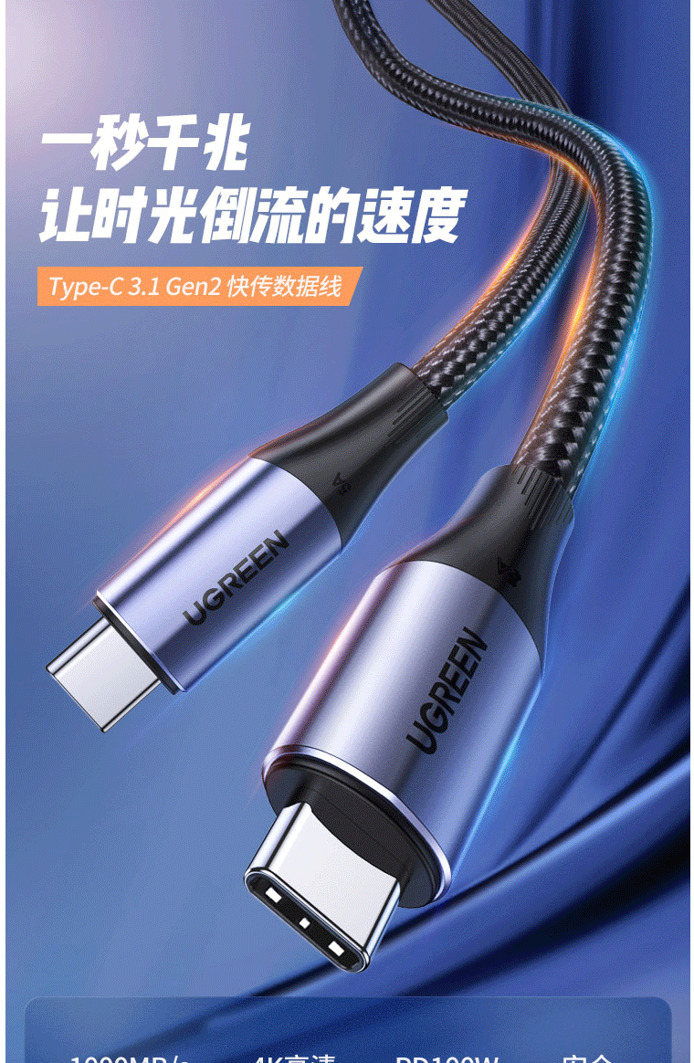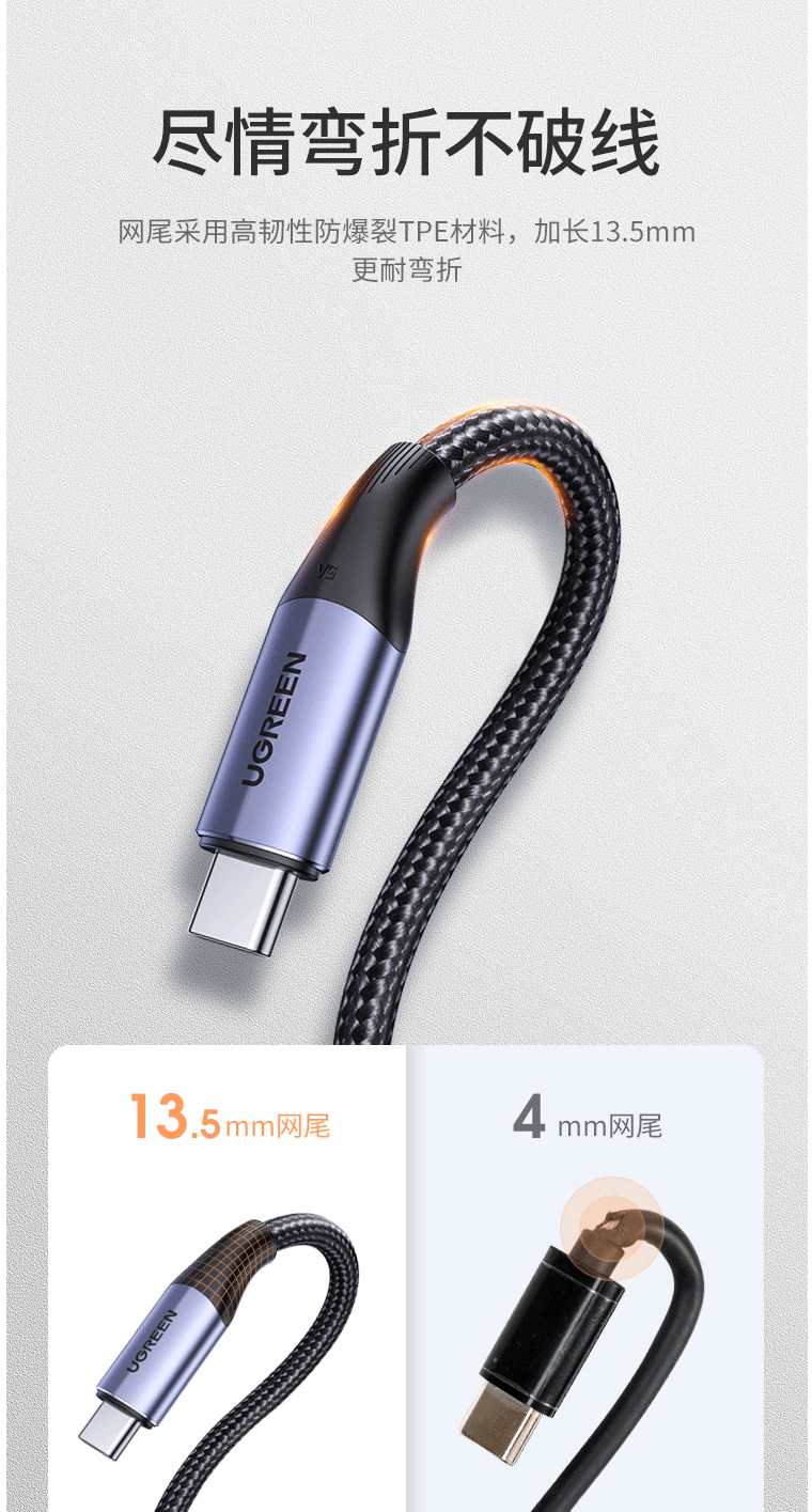 商品名称:绿联 双头Type-C全功能数据线5APD100w快充长线 1米 充电器通用 80150