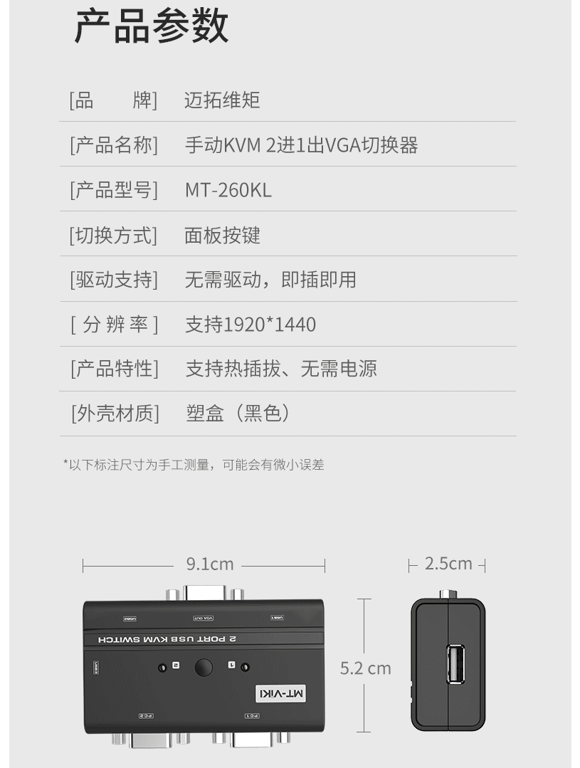 商品名称:迈拓维矩 MT-260KL 2口kvm切换器2进1出vga电脑笔记本监控录像机共用usb键盘鼠标 切屏器