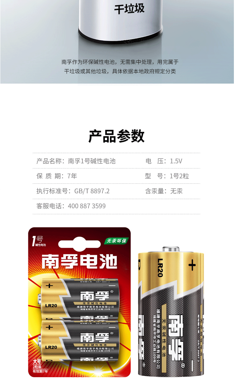 商品名称:南孚 南孚电池 1号 碱性电池2粒 大号电池