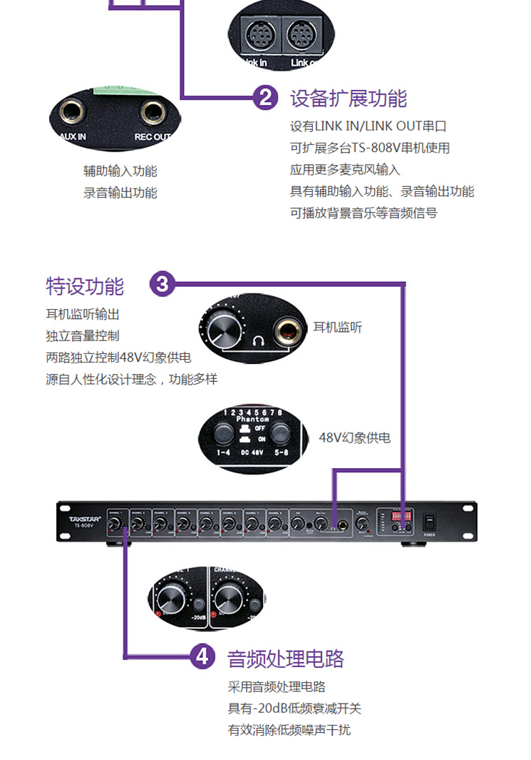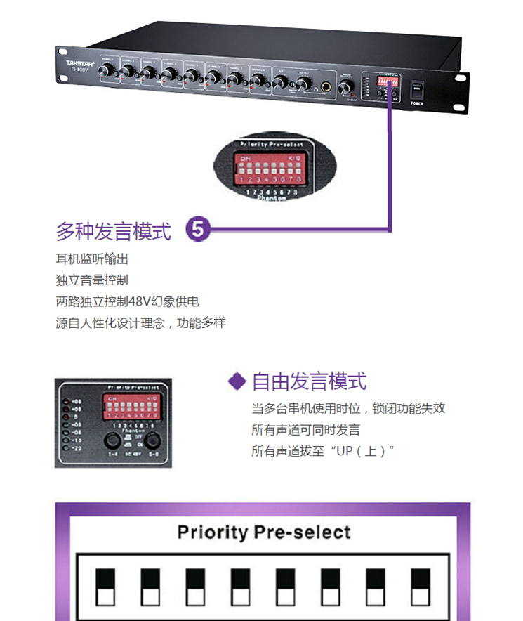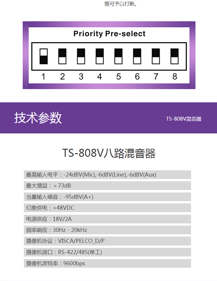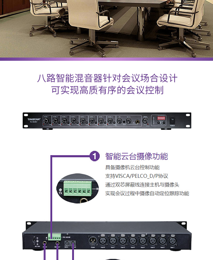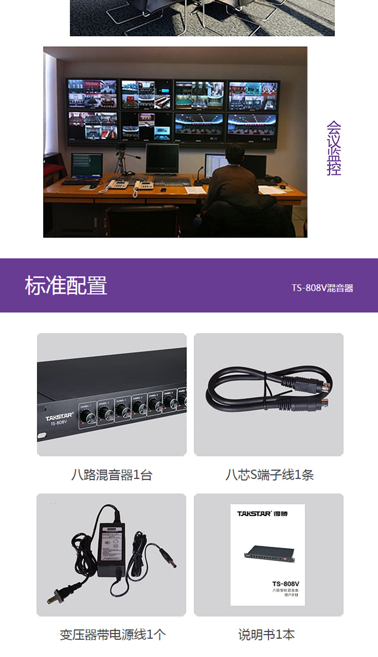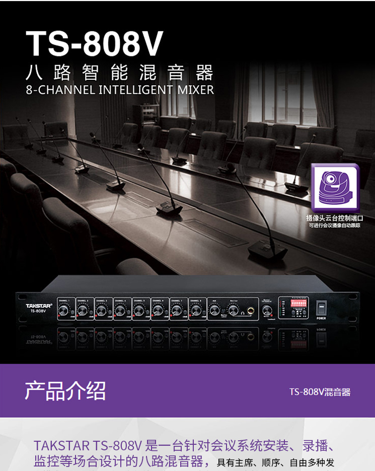 商品名称:得胜(TAKSTAR)TS-808V八路智能混音器 会议系统安装录播监控等场合使用得胜(TAKSTAR)TS-808V八路智能混音器 会议系统安装录播监控等场合使用得胜(TAKSTAR)TS-808V八路智能混音器 会议系统安装录播监控等场