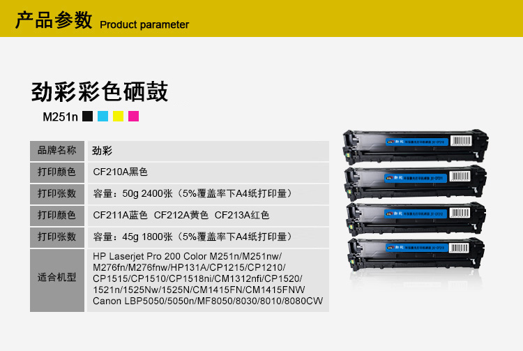 适用机型:HP LaserJet Pro 200 Color M251n/M251nw/M276fn/M276fnw/HP131A/CP1215/CP1210/CP1515/CP1510/CP1518ni/CM1312nfi/CP1520/1521n/1525Nw/1525N/CM1415FN/CM1415FNW/Canon LBP5050/5050n/MF8050/8030/8010/8080CW