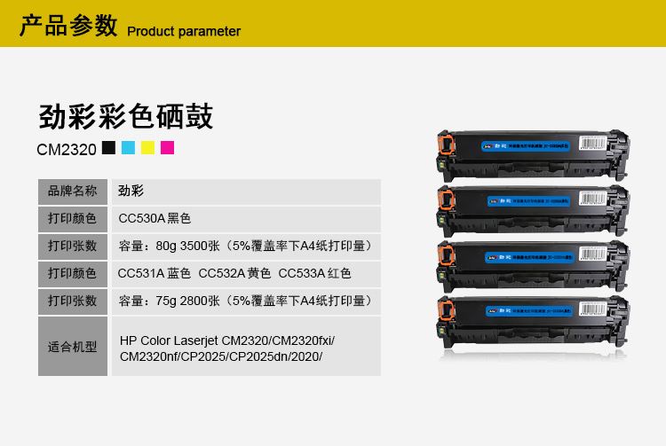商品名称:劲彩CC532A/CF382A/CE412A 硒鼓 适用惠普 CP2025 CM2320 M476nw M351a M451dn 黄色