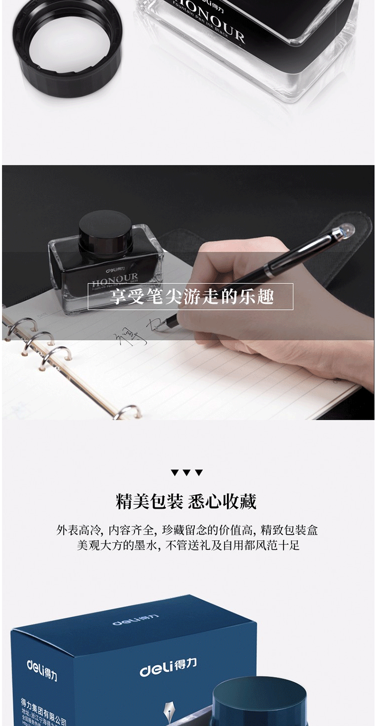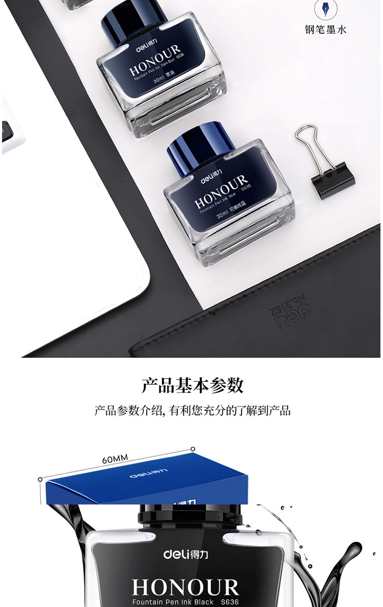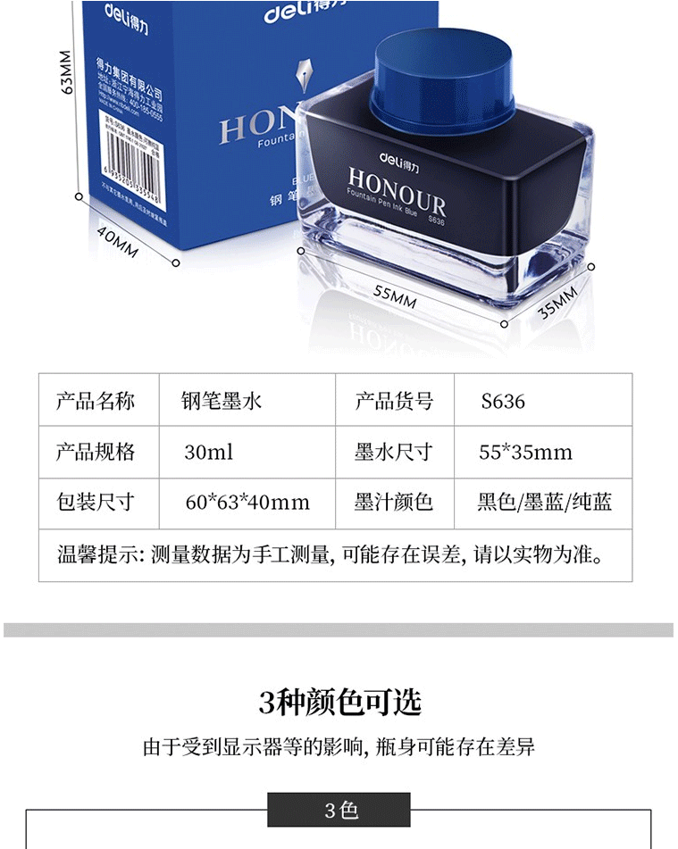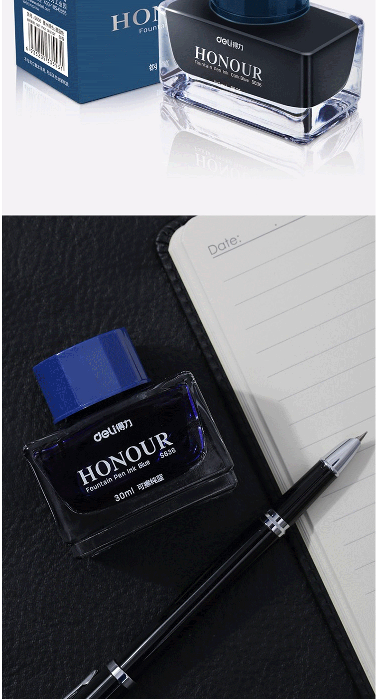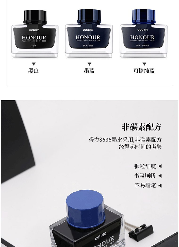 商品名称:得力(deli)S636 30ml非碳素钢笔墨水 墨蓝色