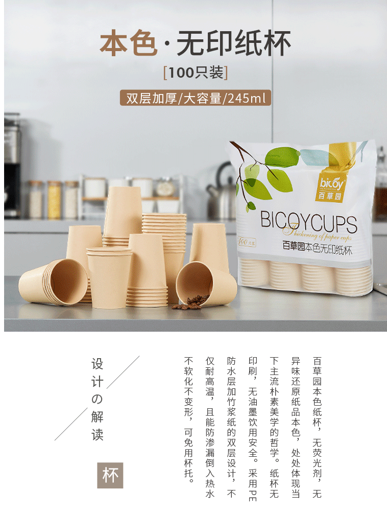 百草园纸杯一次性杯子245ml加厚100只装竹浆本色无印9盎司