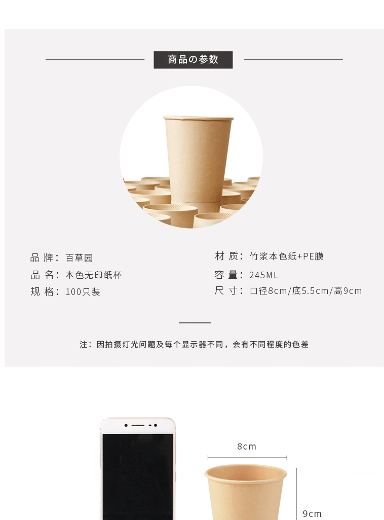 商品名称:百草园纸杯一次性杯子245ml加厚100只装竹浆本色无印9盎司