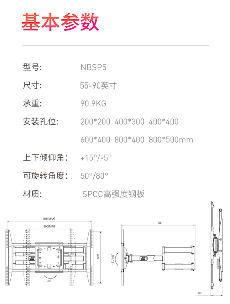 商品名称:NB SP5(55-90英寸)旋转伸缩电视挂架 电视架 电视机长臂挂架 电视支架