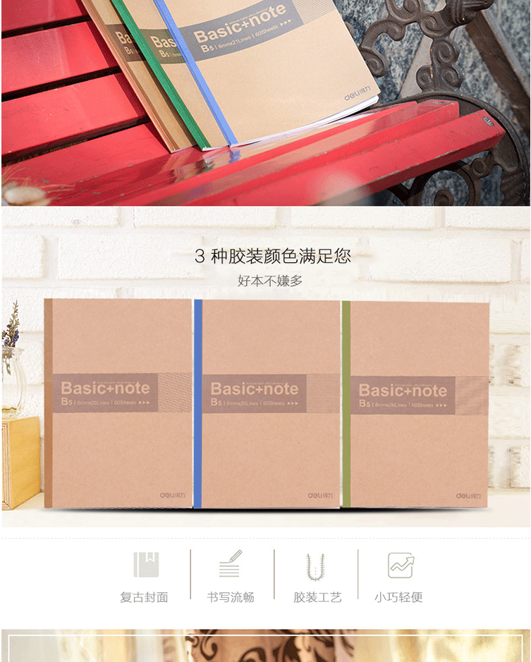 商品名称:得力(deli) B5/60张 无线装订本 软抄本 记事本 工作笔记本子 7661