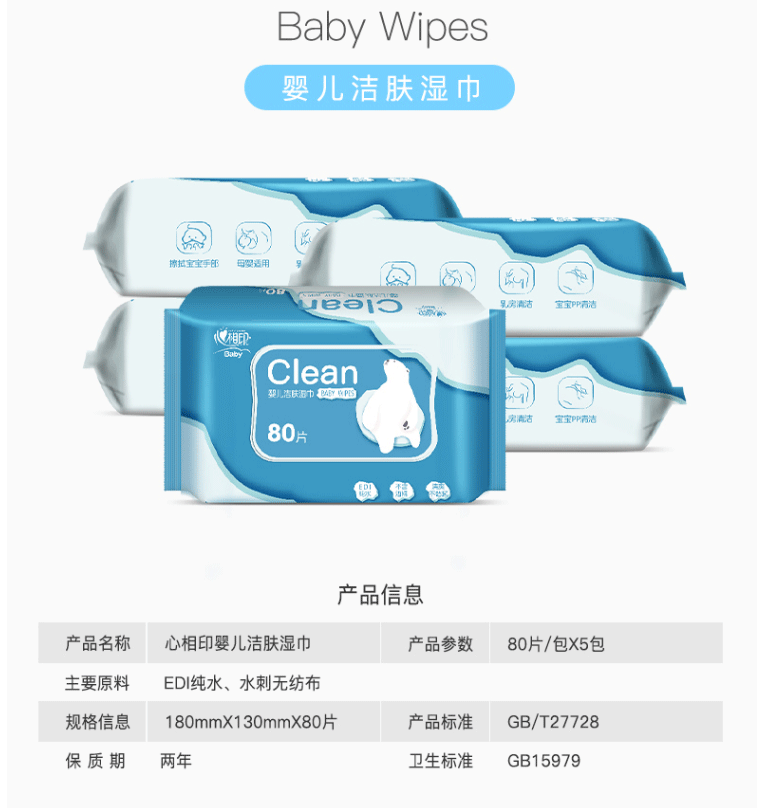 商品名称:心相印湿巾 婴儿洁肤 EDI纯水系列 小白熊 80抽*5包