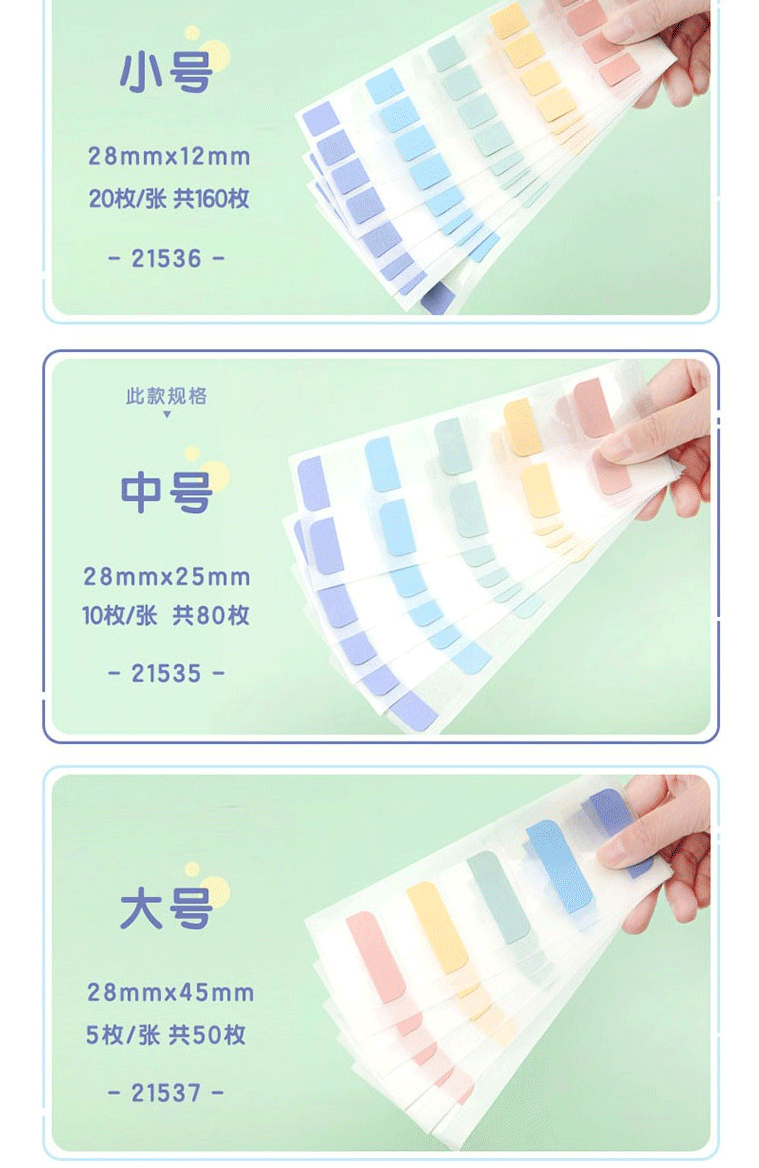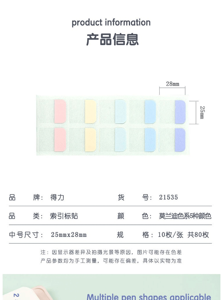 商品名称:得力(deli)便利贴索引贴标签贴纸 彩色便利留言纸 小号-8张160枚/包 21536