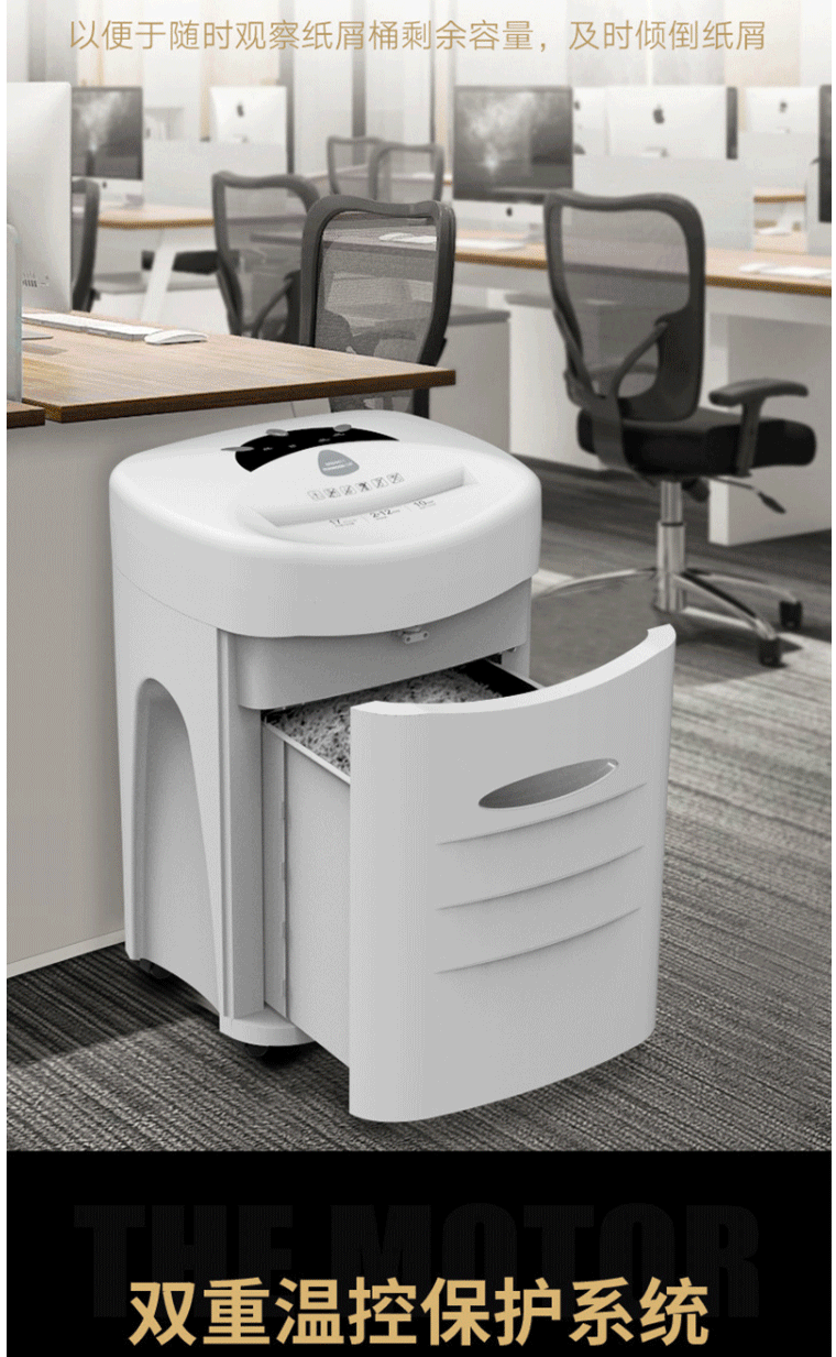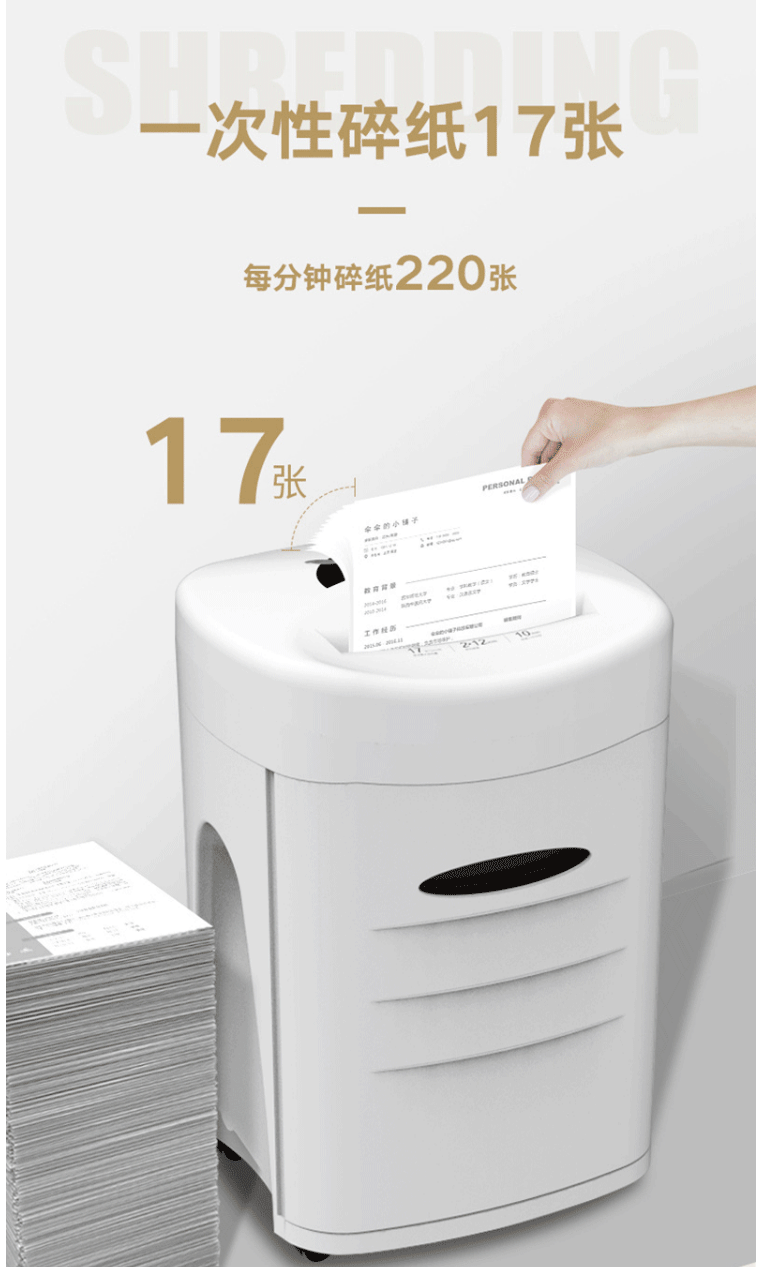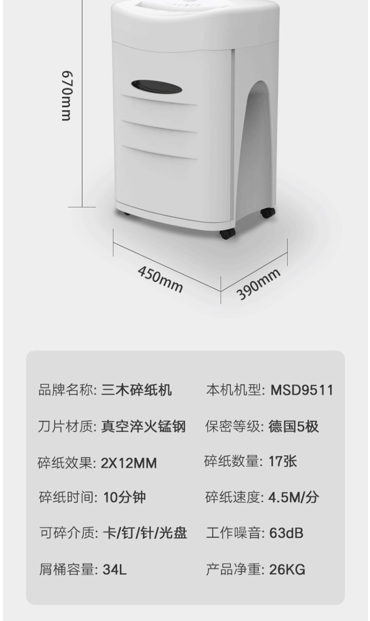 商品名称:三木(SUNWOOD)5级保密办公商用碎纸机 MSD9511(单次17张 持续10分钟 34L 可碎纸,光盘,卡,回形针、订书针)