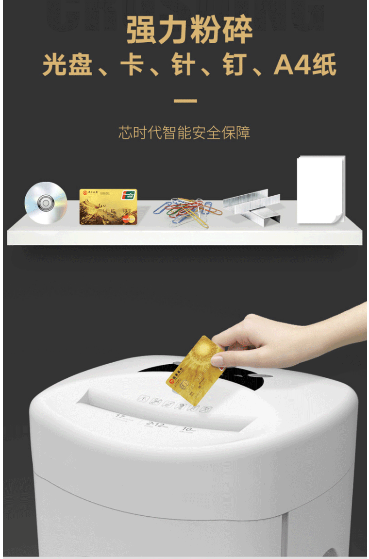 可碎介质:纸,光盘,卡,回形针,订书针
