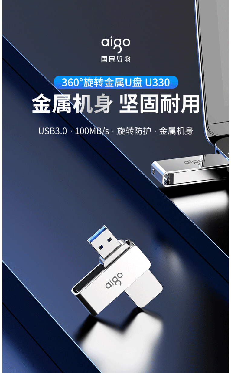 商品名称:爱国者(aigo)64GB USB3.0 U盘 U330金属旋转系列 银色