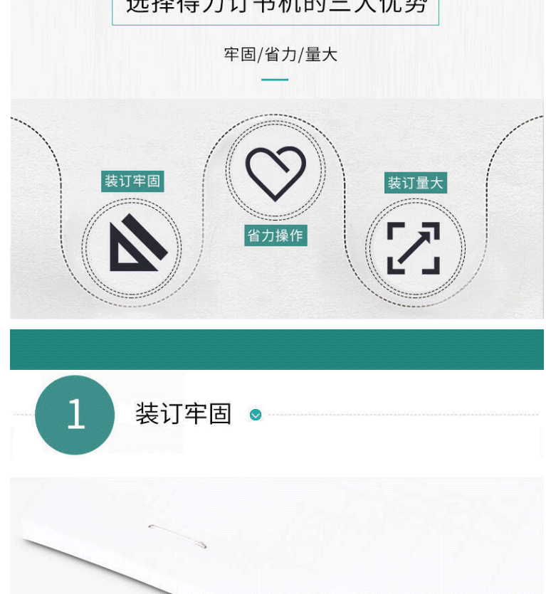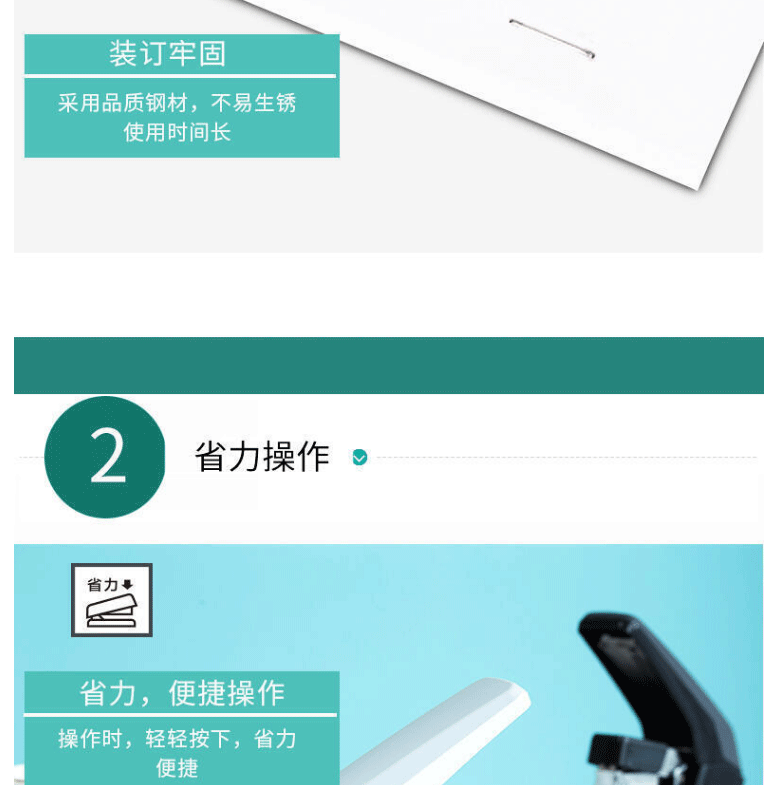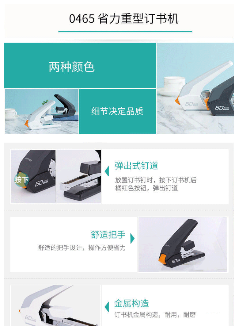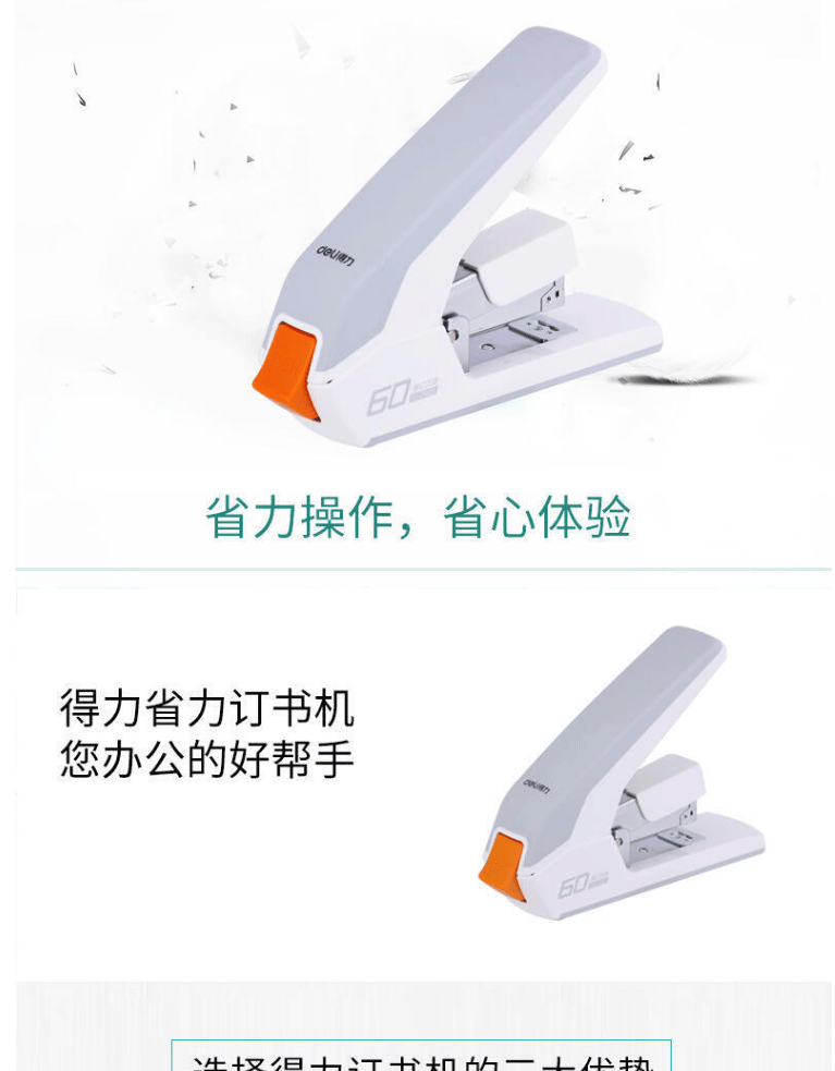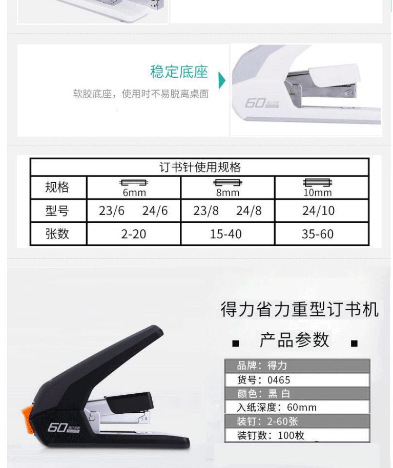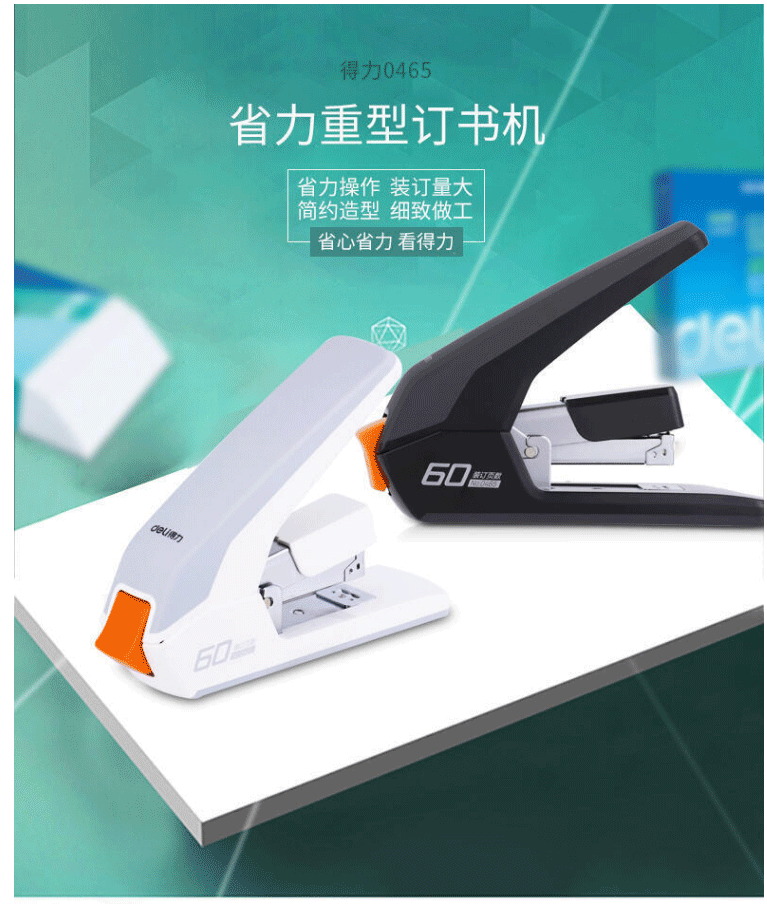 商品名称:得力(deli) 省力订书机 大号重型加厚订书器 可订60页 0465白