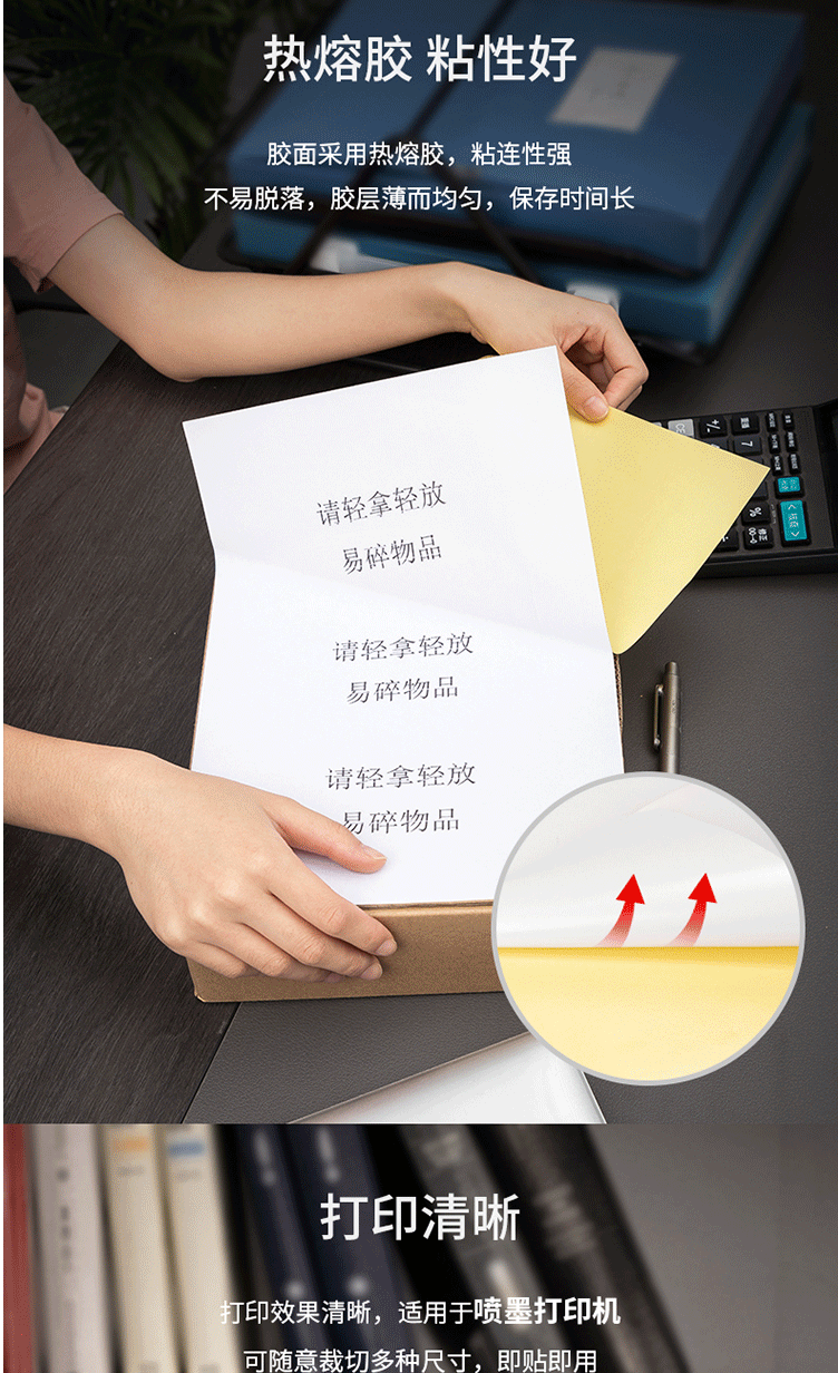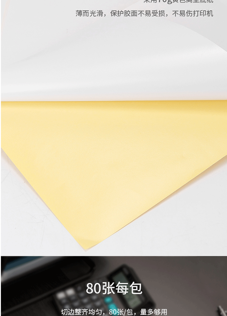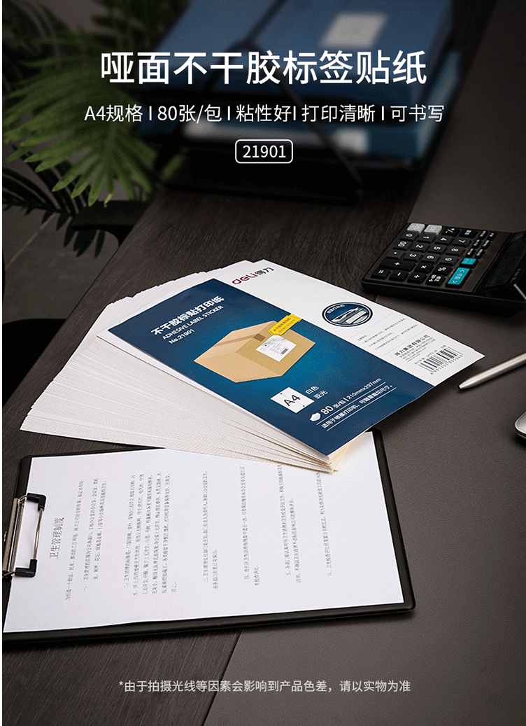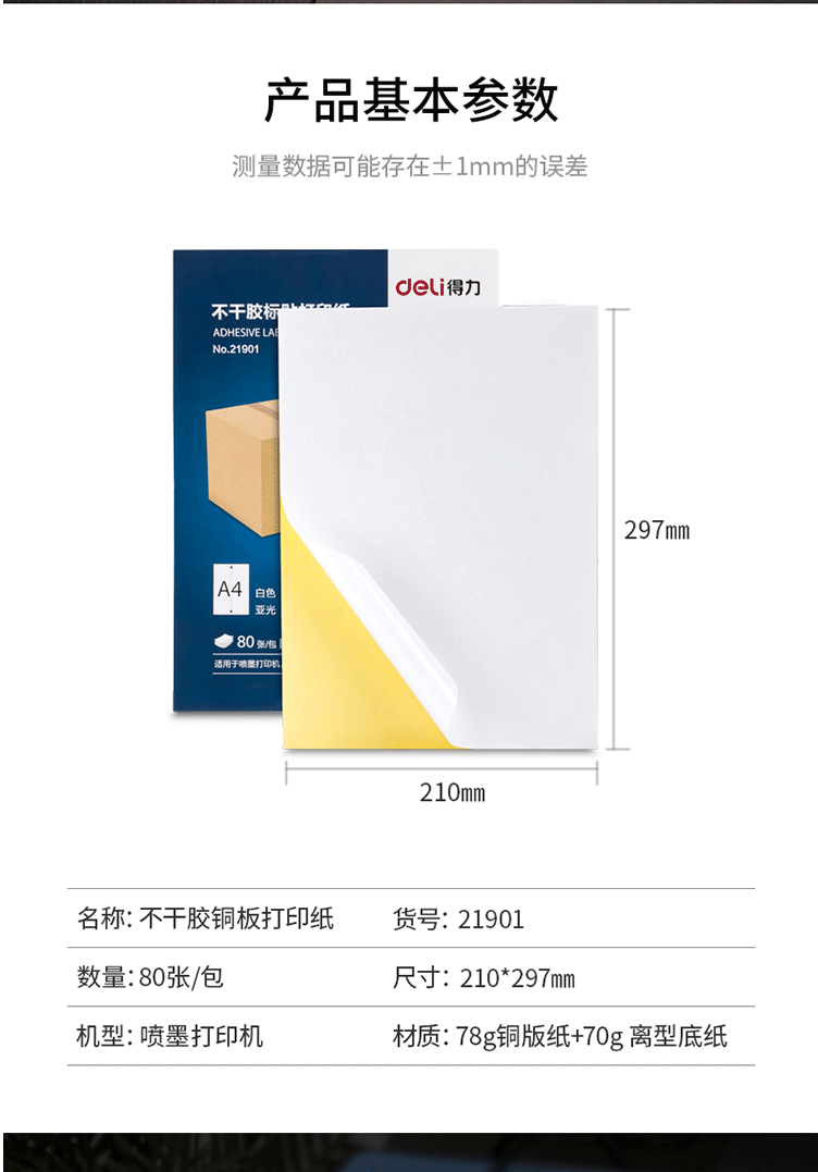 商品名称:得力(deli)A4/80张不干胶标贴打印纸 带背胶亚面铜版标签纸 21901