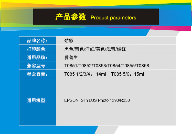 商品名称:劲彩 T0851墨盒 适用爱普生 R330 1390 黑色