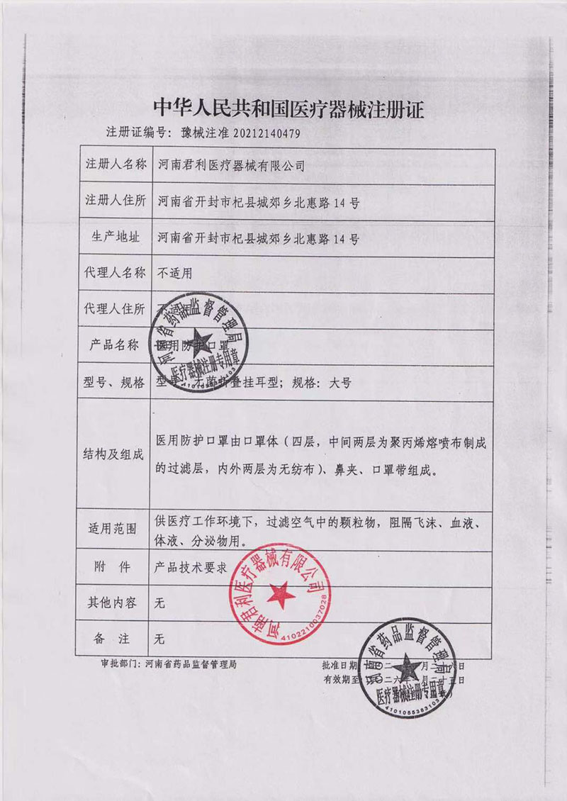 医疗器械注册证编号:豫械注准2021214079