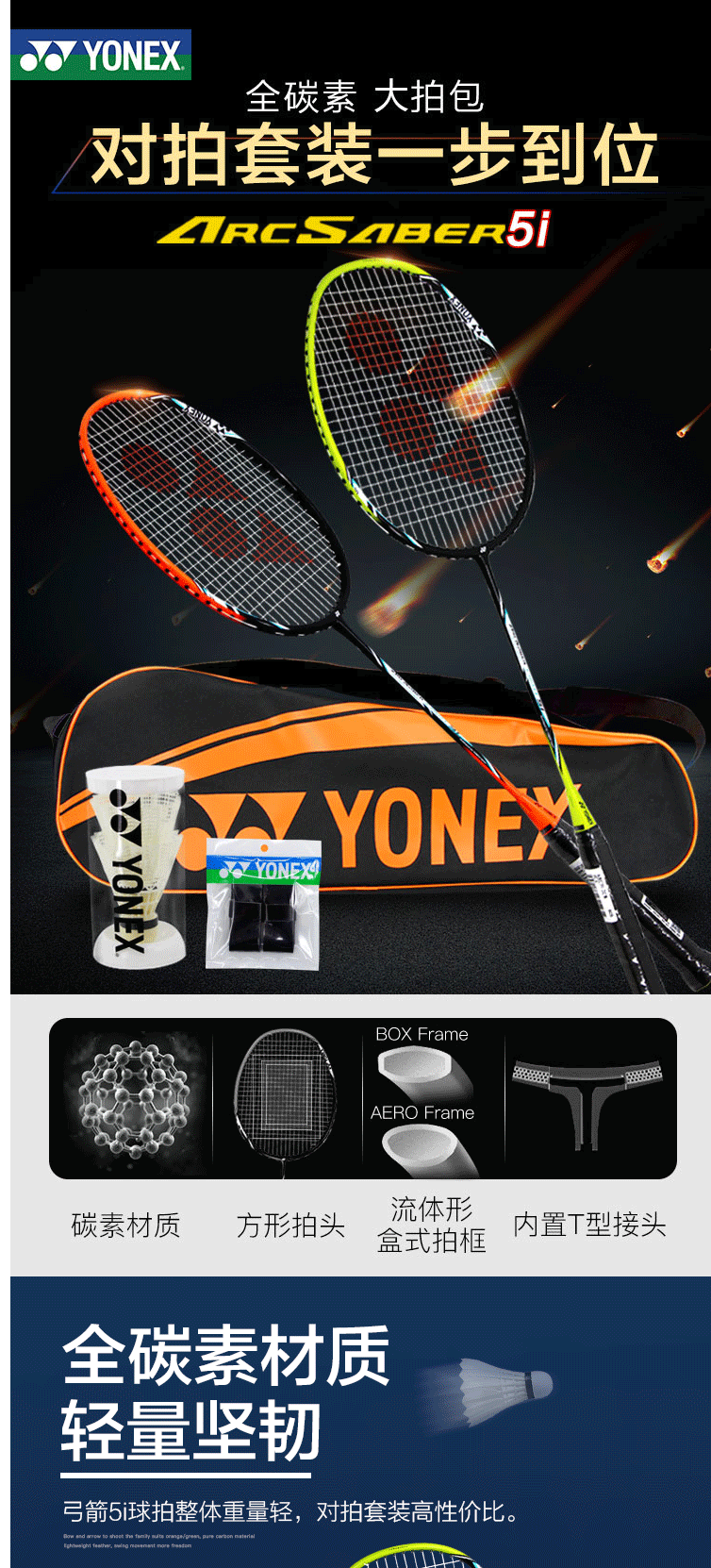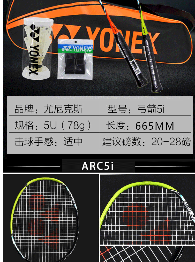 商品名称:尤尼克斯YONEX羽毛球拍对拍弓箭经典攻守兼备套装ARC5I内附手胶/大拍包/尼龙球