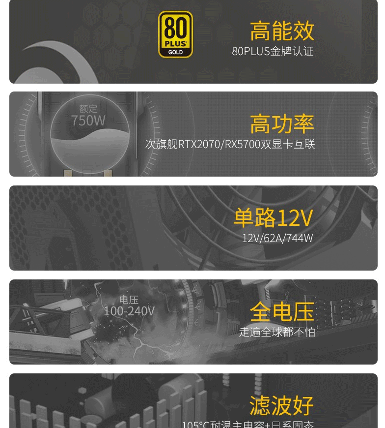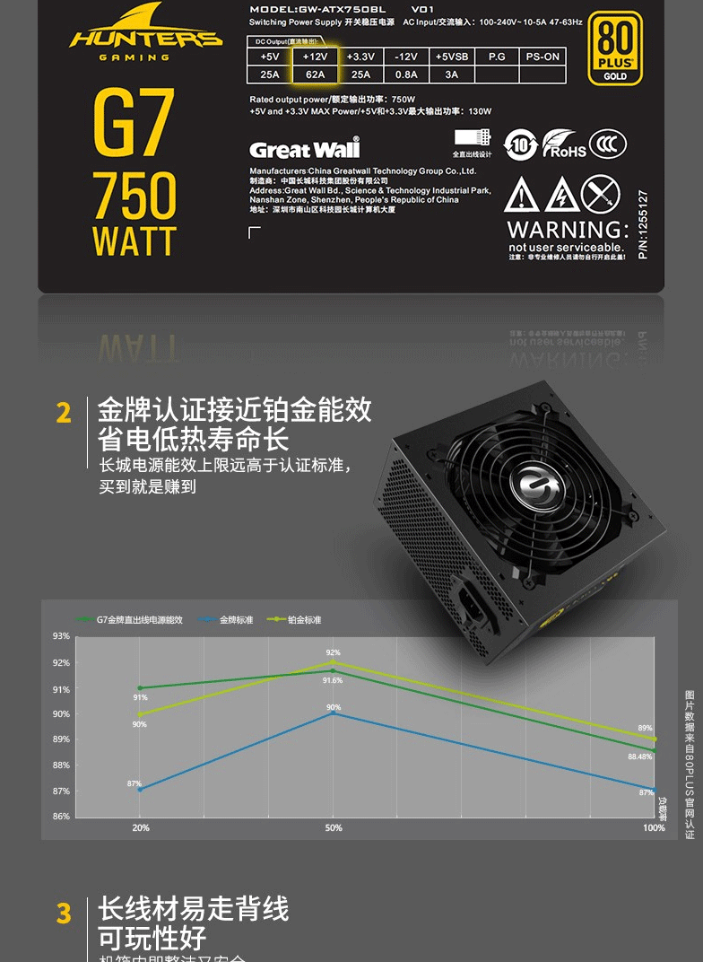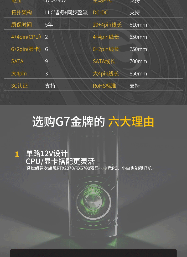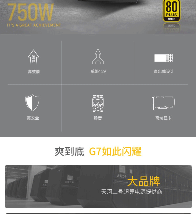 商品名称:长城(Great Wall)G系列台式机电脑电源 80PLUS认证 G7金牌全模组(额定750W)