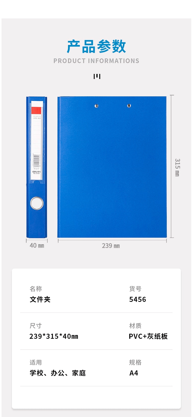 商品名称:得力(deli)A4文件夹双夹加厚硬纸板夹板夹资料夹 5456蓝