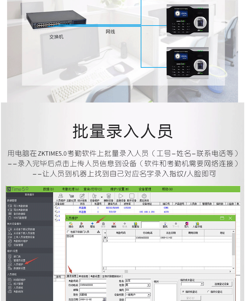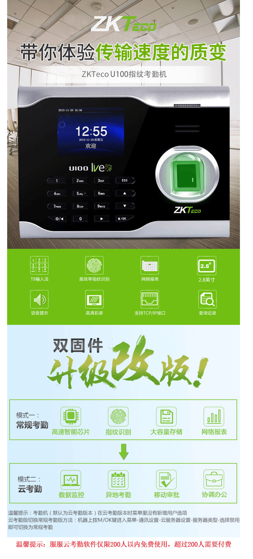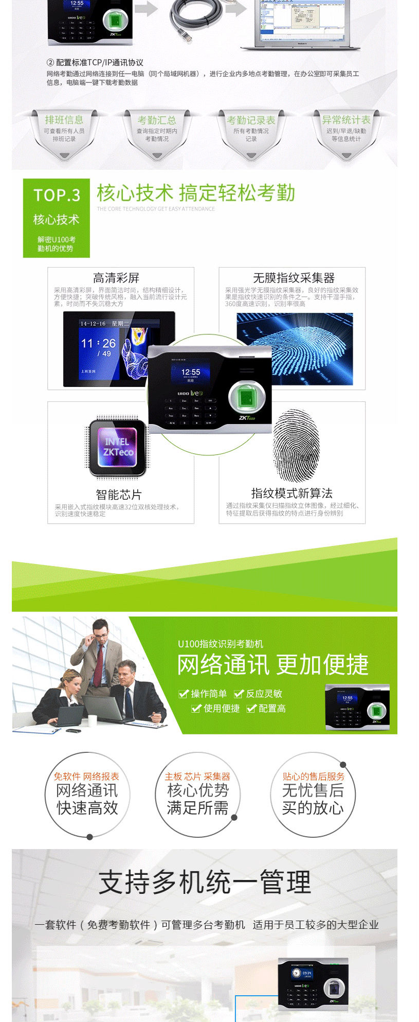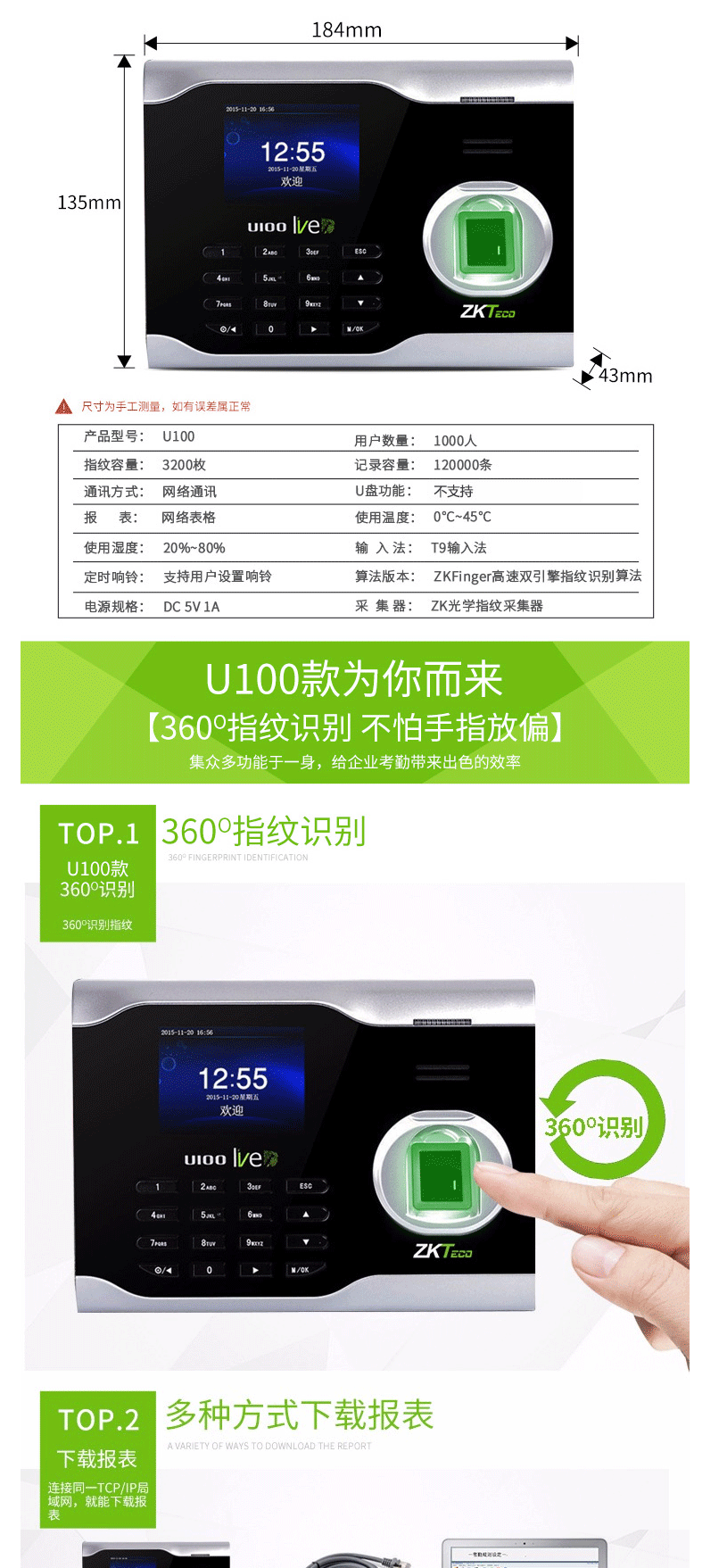 商品名称:ZKTeco/熵基科技U100指纹考勤机 专业型指纹打卡机 TCP/IP传输 考勤机