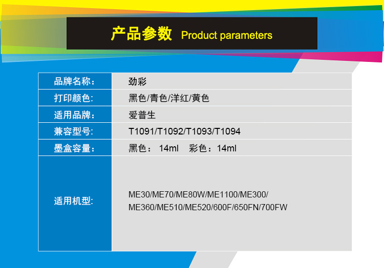 商品名称:劲彩 T1091墨盒 适用爱普生ME30/ME70/ME80W/ME1100/ME360/ME510/ME520/650FN/700FW 黑色