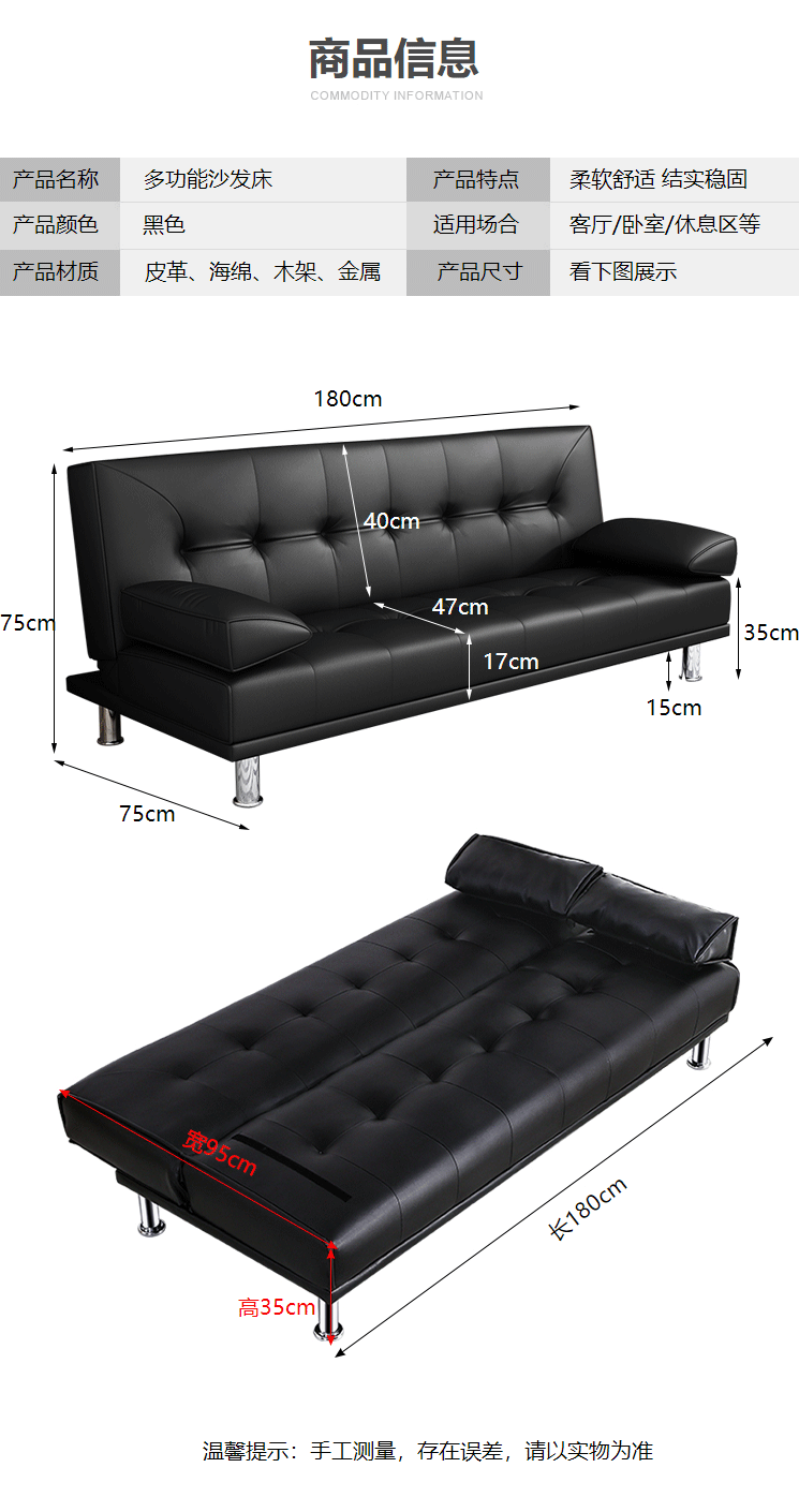 商品名称:折叠两用沙发 双人位皮革沙发 1.8米
