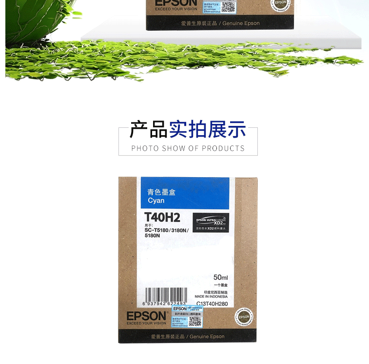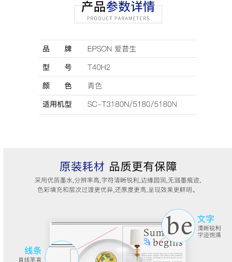 商品名称:爱普生(EPSON)C13T40H280 青色墨水 (适用于SC-T3180N/3180M/5180/5180N机型)约50ml