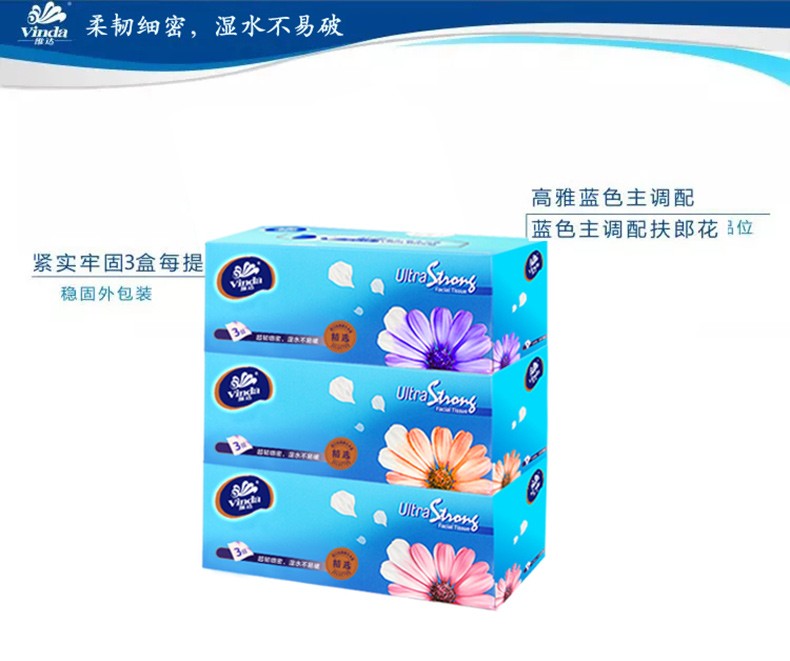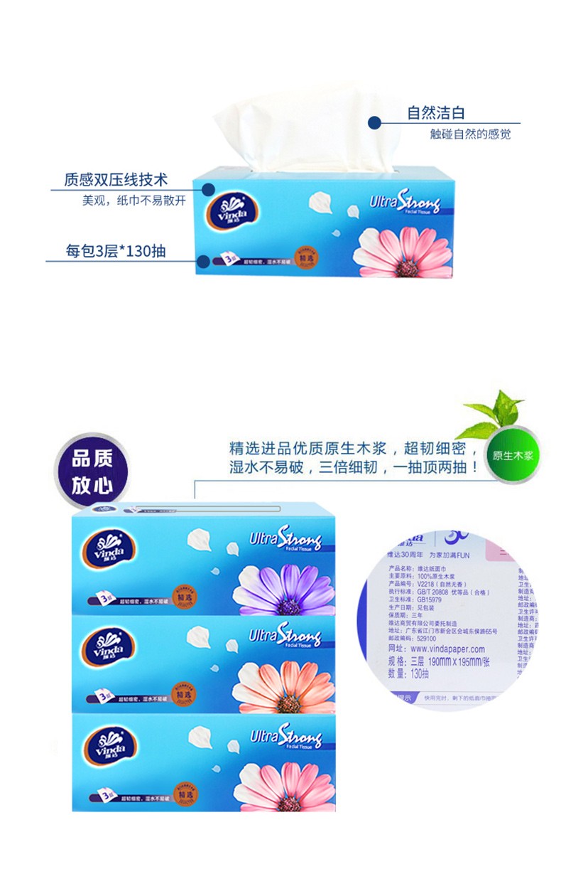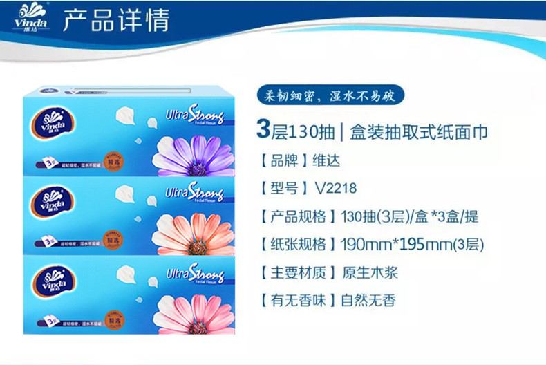 商品名称:维达(Vinda) 硬盒抽纸巾V2218 纸抽 面巾纸 餐巾纸 130抽三层面巾纸餐纸 3盒/提 12提/箱