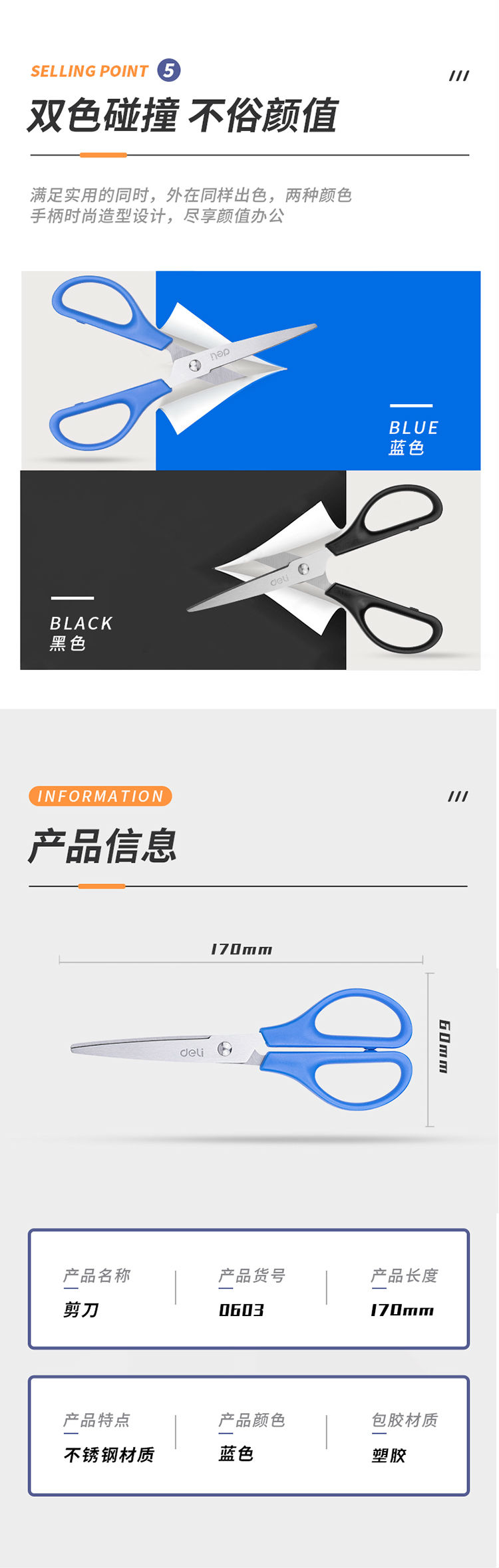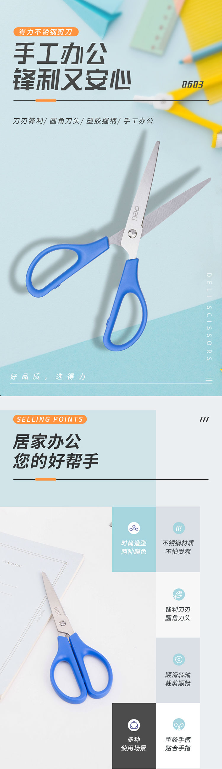 商品名称:得力(deli)170mm办公剪刀 1把 办公用品 0603蓝色