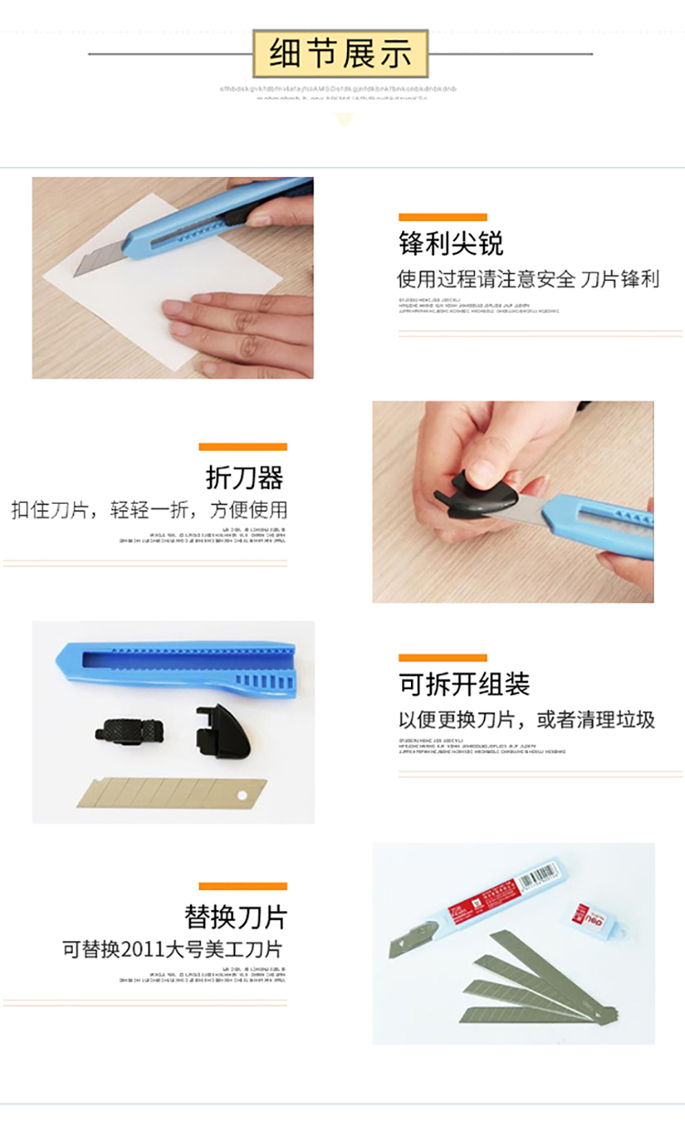 商品名称:得力(deli)大号耐用美工刀 手动锁定功能裁纸刀/壁纸刀 2003 蓝色(个)