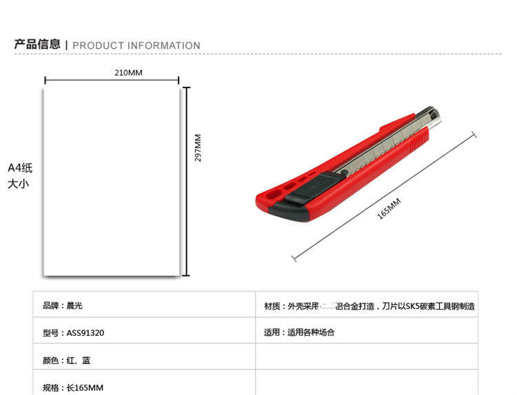 商品名称:晨光(M&G) 18mm大号通用办公美工刀/裁纸刀/壁纸刀 ASS91320颜色随机