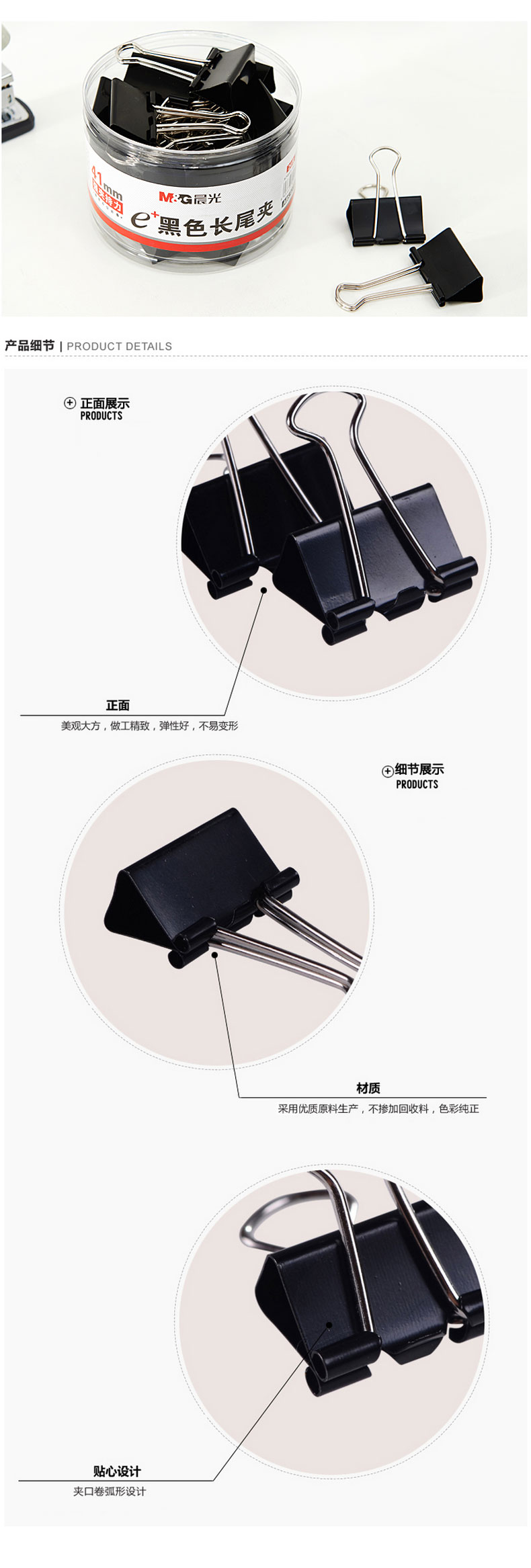 商品名称:晨光(M&G)41mm黑色长尾夹 金属夹票据夹 办公燕尾夹 24只/罐 ABS92733