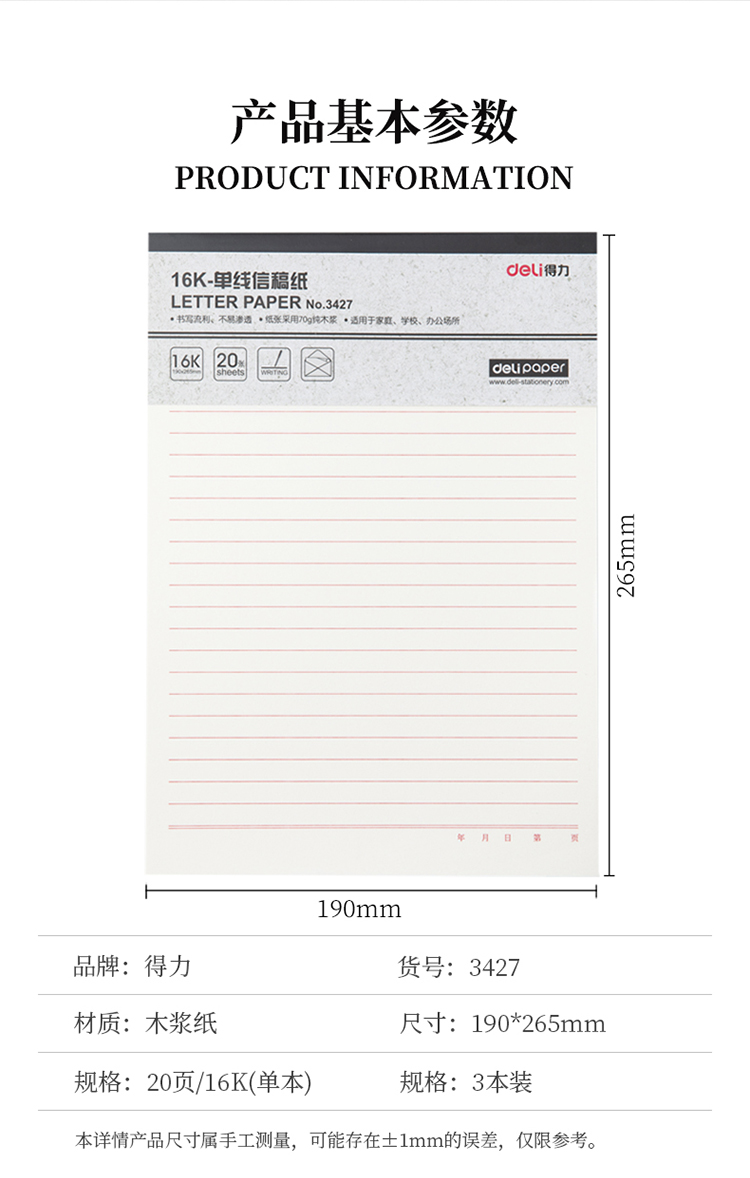 商品名称:得力信稿纸 单线信纸-70g-266*190mm 得力3427(单位:本)
