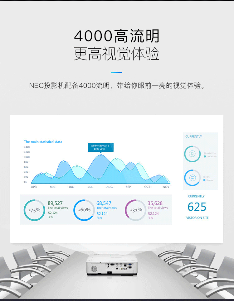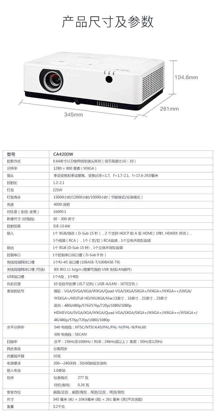 商品名称:投影 NEC NP-CA4200W 投影仪 投影机 商用 办公(4000流明 四点几何校正 WXGA分辨率 )