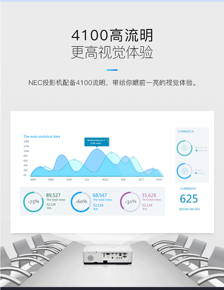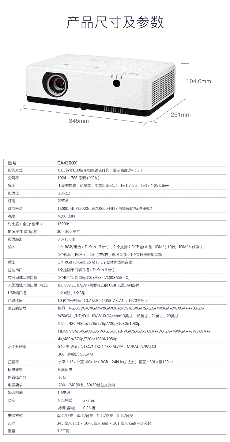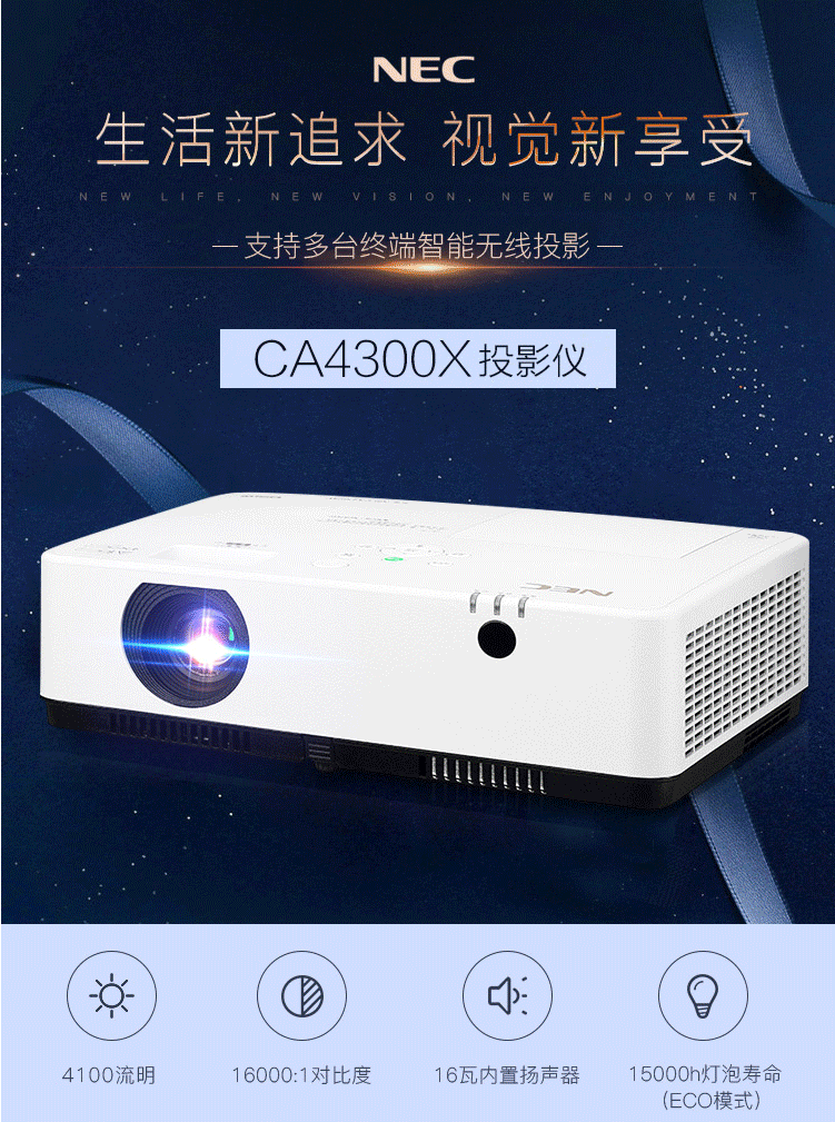 商品名称:NEC NP-CA4300X 投影仪 投影机 商用 办公(4100流明 四点几何校正)