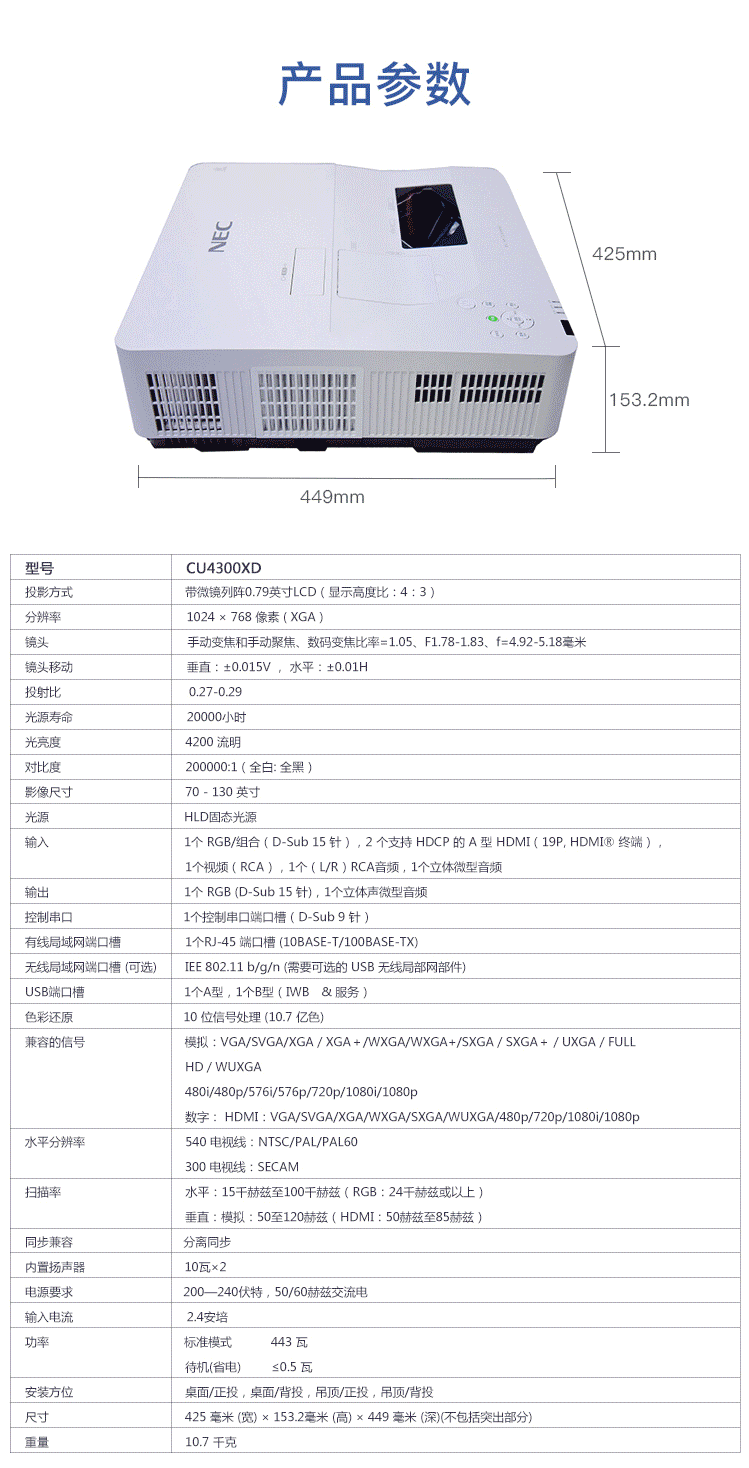 商品名称:NEC NP-CU4300XD 投影仪 投影机 商用 办公(4200流明 超短焦投影)