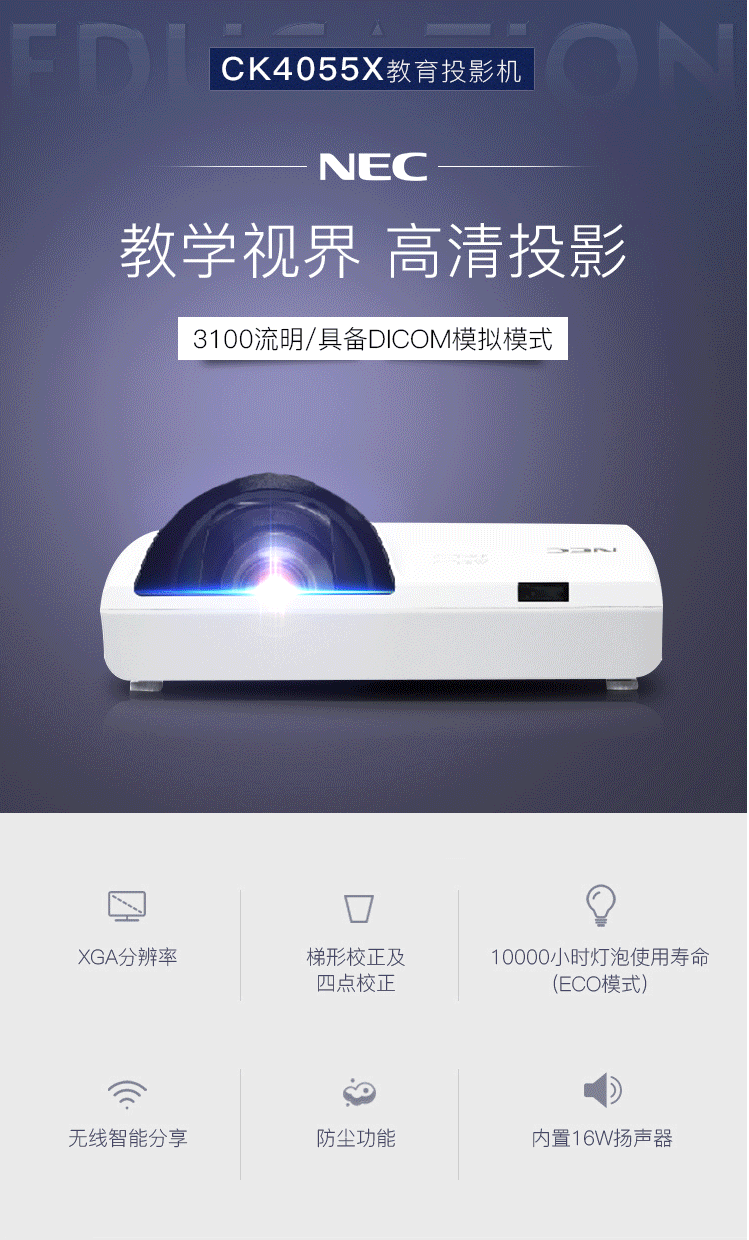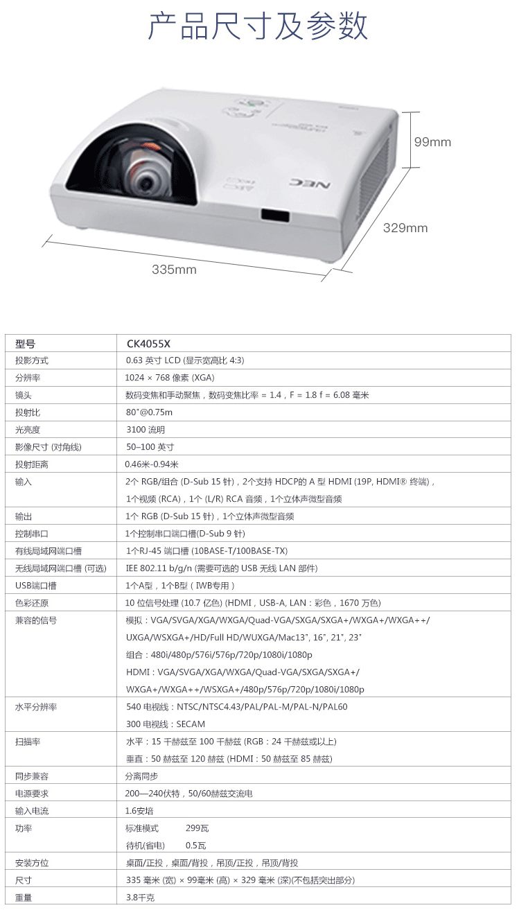 商品名称:NEC NP-CK4055X 短焦投影仪 投影机(四点影像校正 3100流明 HDMI )