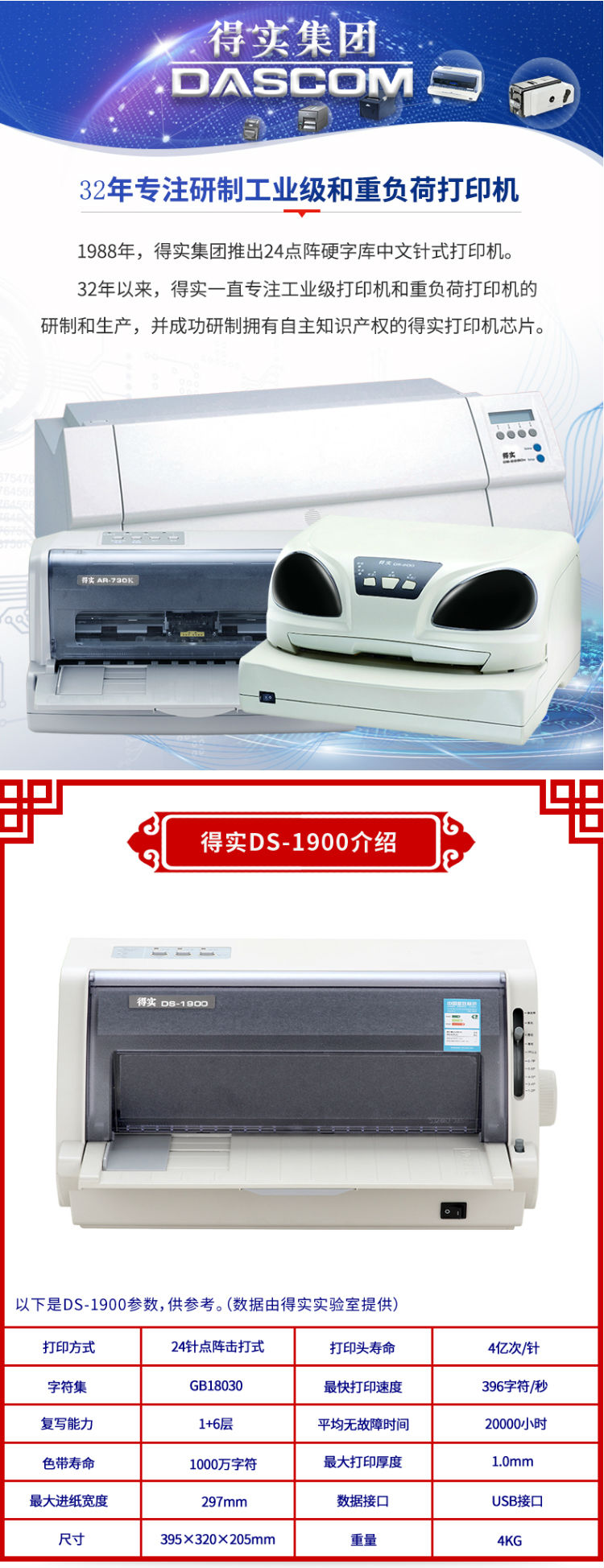 商品名称:得实(Dascom)DS-1900 高速24针平推 82列票据打印机