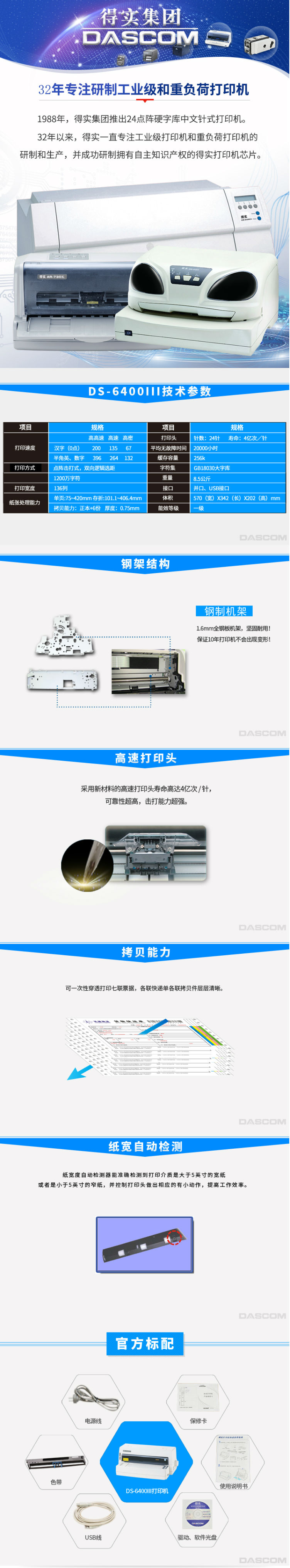 商品名称:得实(Dascom)DS-6400III 高速24针136列专业平推式票据打印机