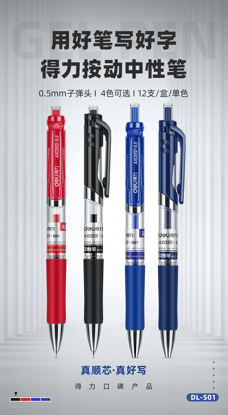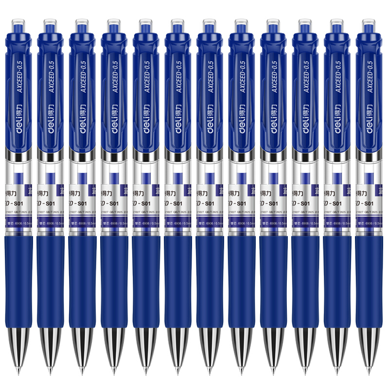得力S01中性笔 按动碳素笔 0.5mm弹簧头 蓝色 (单位:盒)