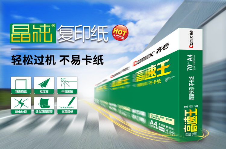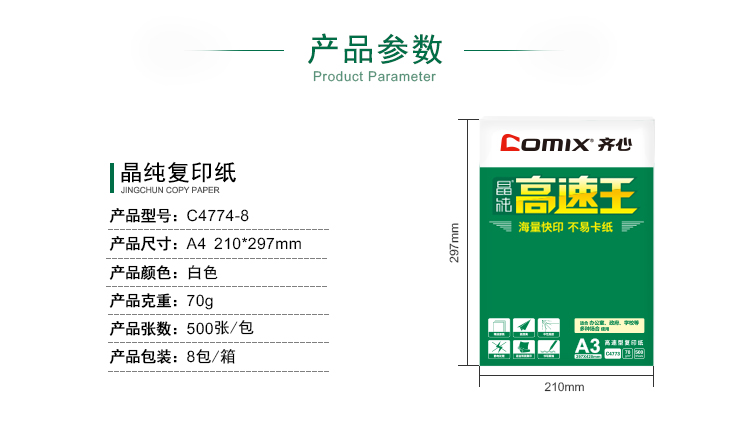 商品名称:齐心 C4774-8 晶纯高速王复印纸70克 A4 500张/包 8包/箱(单位:箱)
