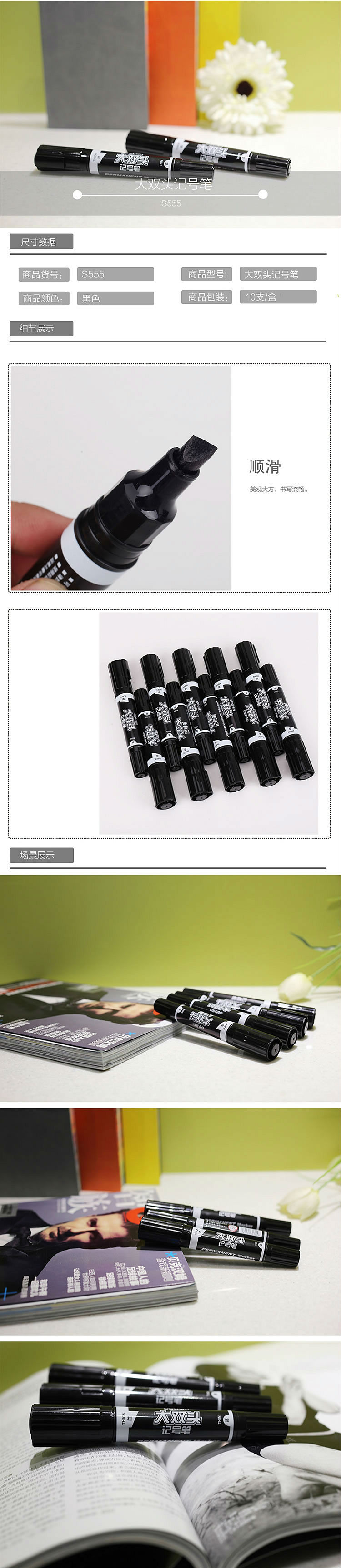 商品名称:得力 S555 大双头记号笔 1.5-6mm 黑色(单位:支)