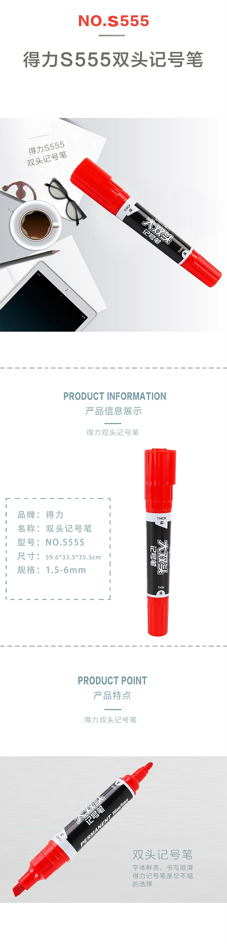 商品名称:得力 S555 大双头记号笔 1.5-6mm 红色(单位:支)