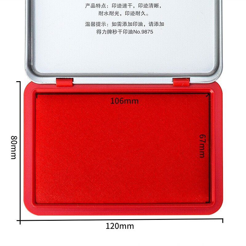 商品名称:得力(deli)金属方形 中号120*80mm秒干印台印泥 9892红色(单位:个)